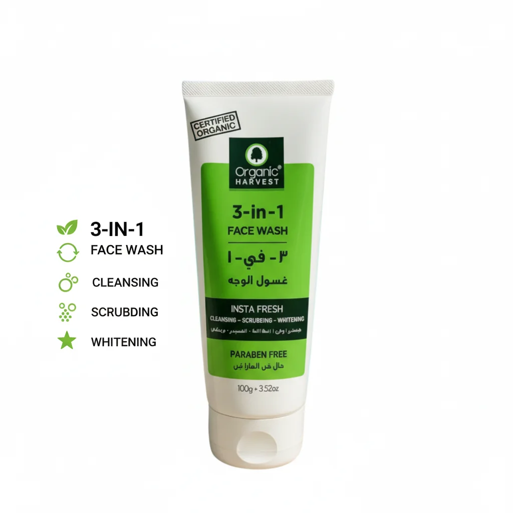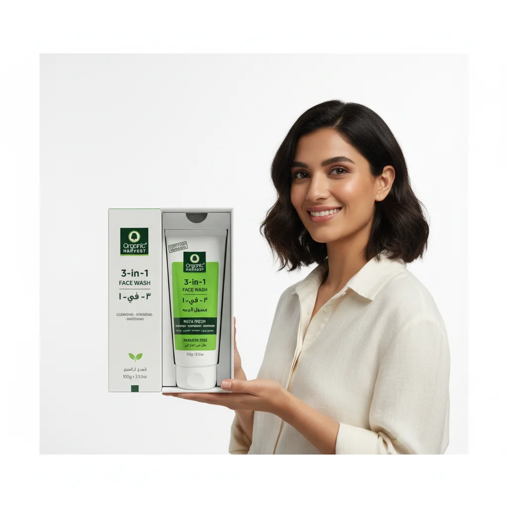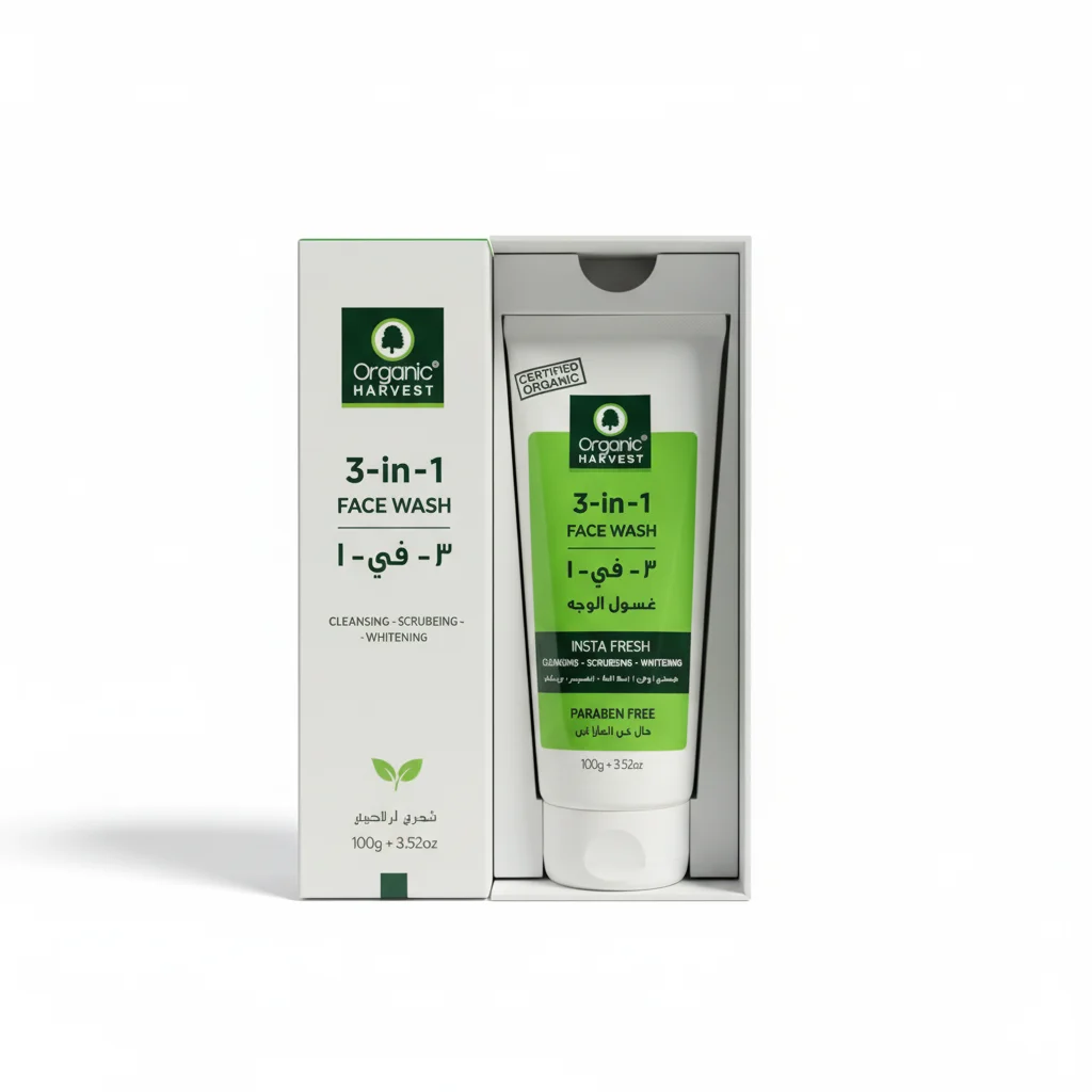 The Organic Harvest Organic 3-in-1 Face Wash is a certified organic, multi-action facial cleanser designed to deliver three key benefits in one simple step: cleansing, exfoliating, and whitening (or brightening, as “whitening” is often used in a brightening context). This innovative formula deeply purifies the skin by removing dirt, oil, and impurities, while its gentle exfoliating action helps to shed dead skin cells for a smoother texture. The “whitening” aspect aims to reduce the appearance of dark spots and promote a more even, radiant complexion. Infused with natural ingredients, it helps to invigorate the skin, leaving it feeling fresh, clean, and revitalized without over-drying. Ideal for those seeking an efficient and comprehensive solution for brighter, clearer skin, this face wash comes in a convenient tube, elegantly packaged in an eco-friendly carton, reflecting Organic Harvest’s commitment to natural beauty and sustainability.