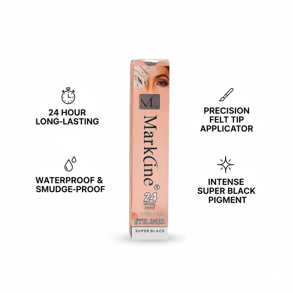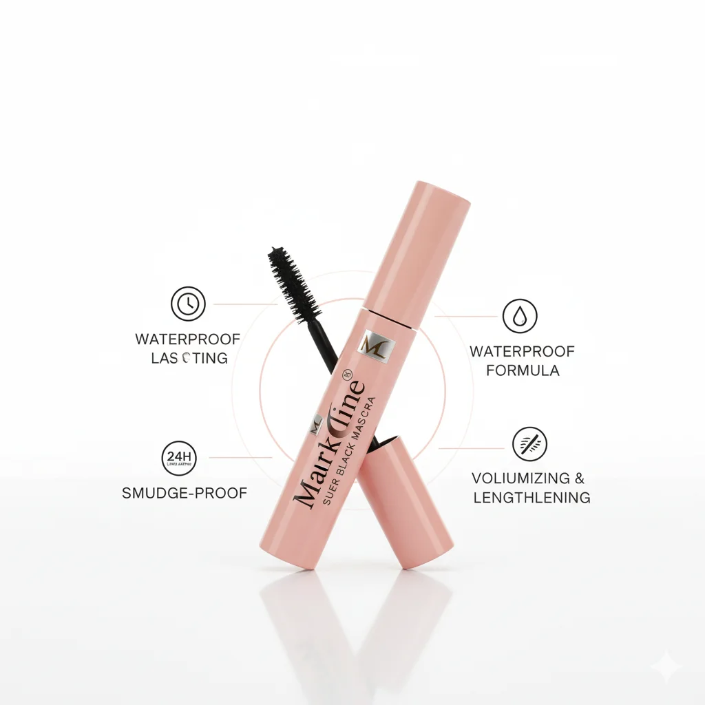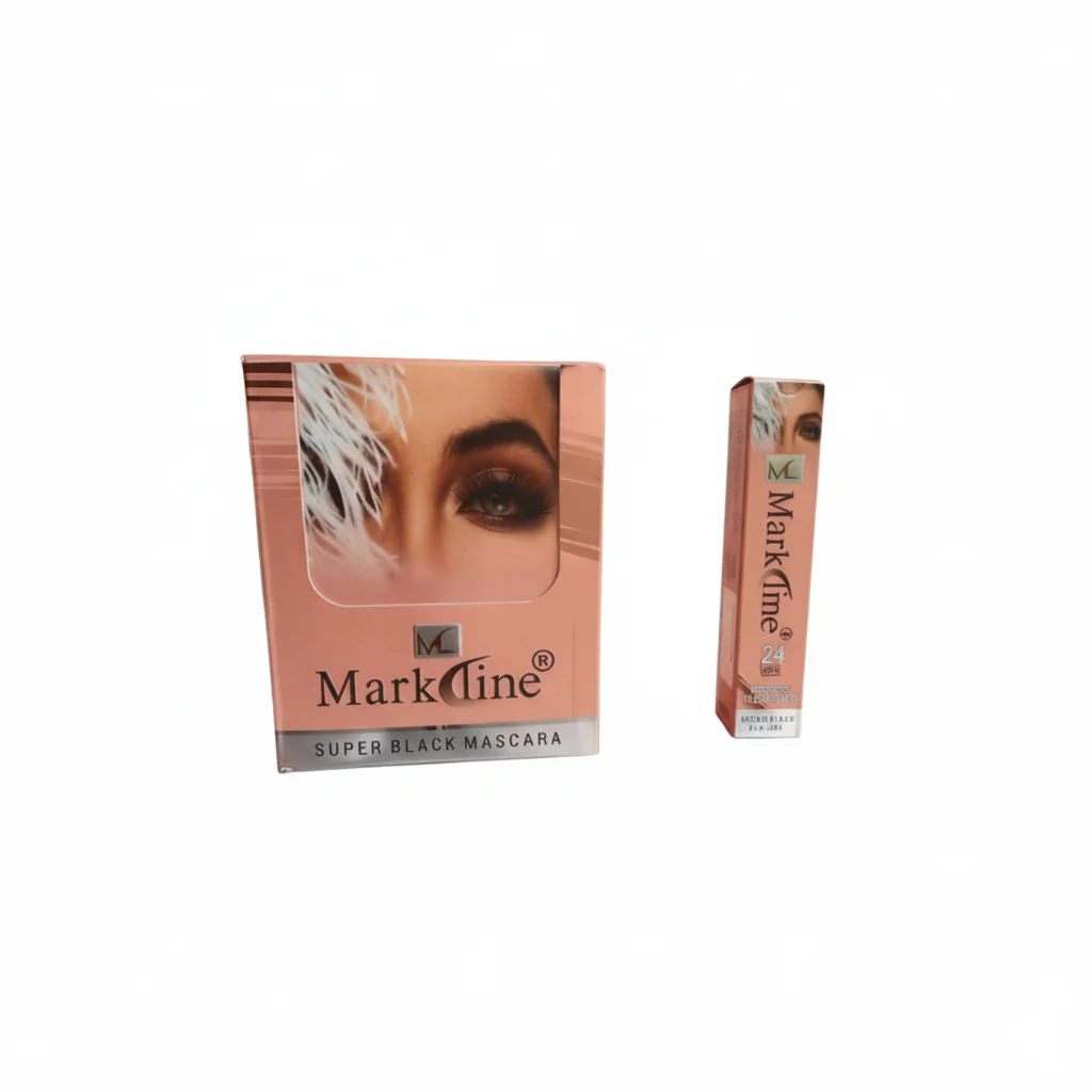 The product is a mascara from the brand “Mark Tine,” specifically labeled as “Super Black Mascara.” It is shown with its outer packaging box and the mascara tube itself, which also comes in its own smaller box. The main box is predominantly light pink/peach with an image of a dramatic eye with long, dark lashes, partially obscured by a feathery design, emphasizing the product’s intended effect. The “Mark Tine” logo is featured prominently. The smaller, elongated box for the mascara tube confirms it is “MICRO BLACK” mascara and mentions “24H” (likely indicating 24-hour wear) and “Waterproof.” The mascara tube itself is sleek and likely features the same branding as the packaging.