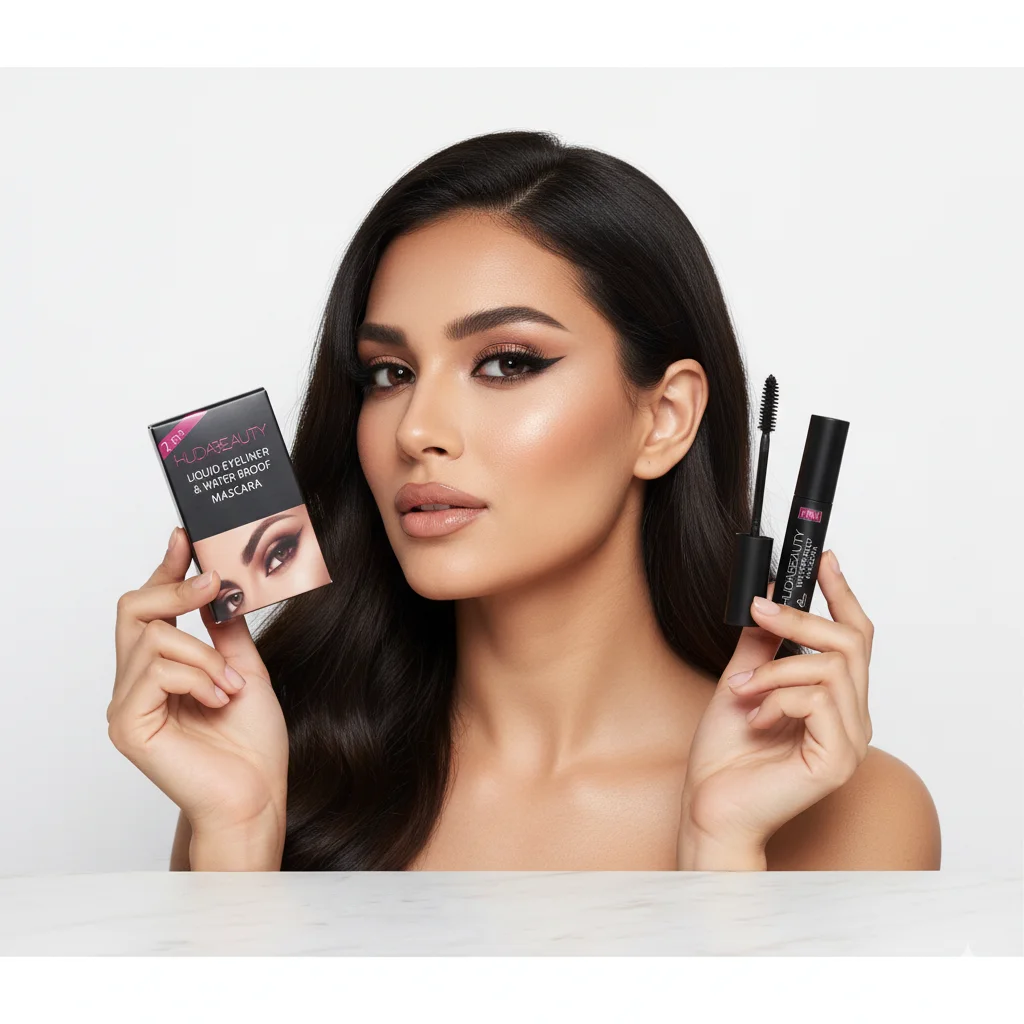 This product is a versatile 2-in-1 beauty tool from HUDABEAUTY, designed for eye makeup. It combines a liquid eyeliner and a waterproof mascara into a single, dual-ended product, offering convenience and saving space. The product is presented with its components separated to highlight both functions: one part is the mascara wand with its brush, and the other two parts are the sleek, black tubes housing the liquid eyeliner and waterproof mascara. Both tubes prominently feature the “HUDABEAUTY” brand name and a pink “2 IN 1” label. The packaging emphasizes a “WATERPROOF FORMULA,” “DUAL-ENDED CONVENIENCE,” and “LONG-LASTING WEAR” through accompanying icons and text.