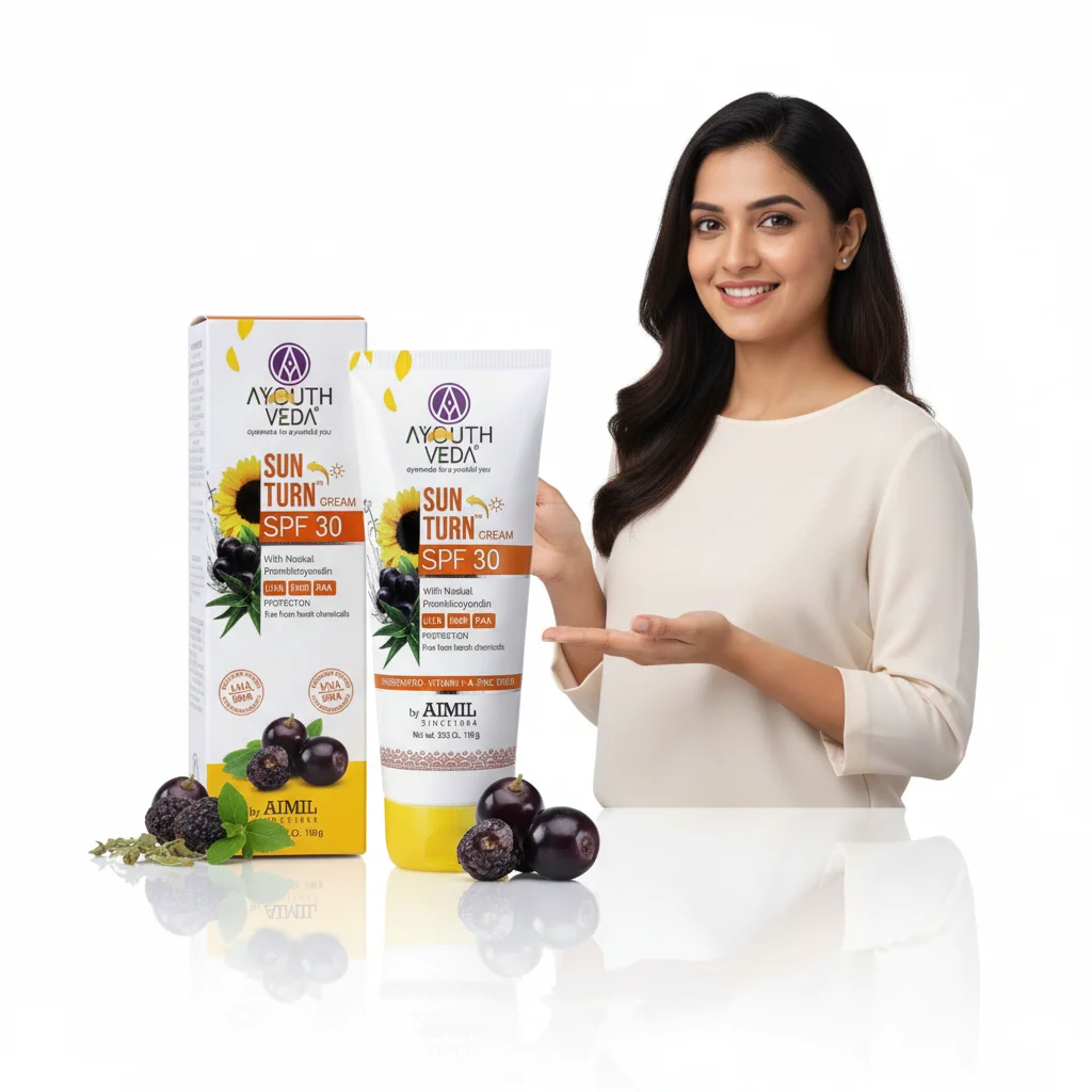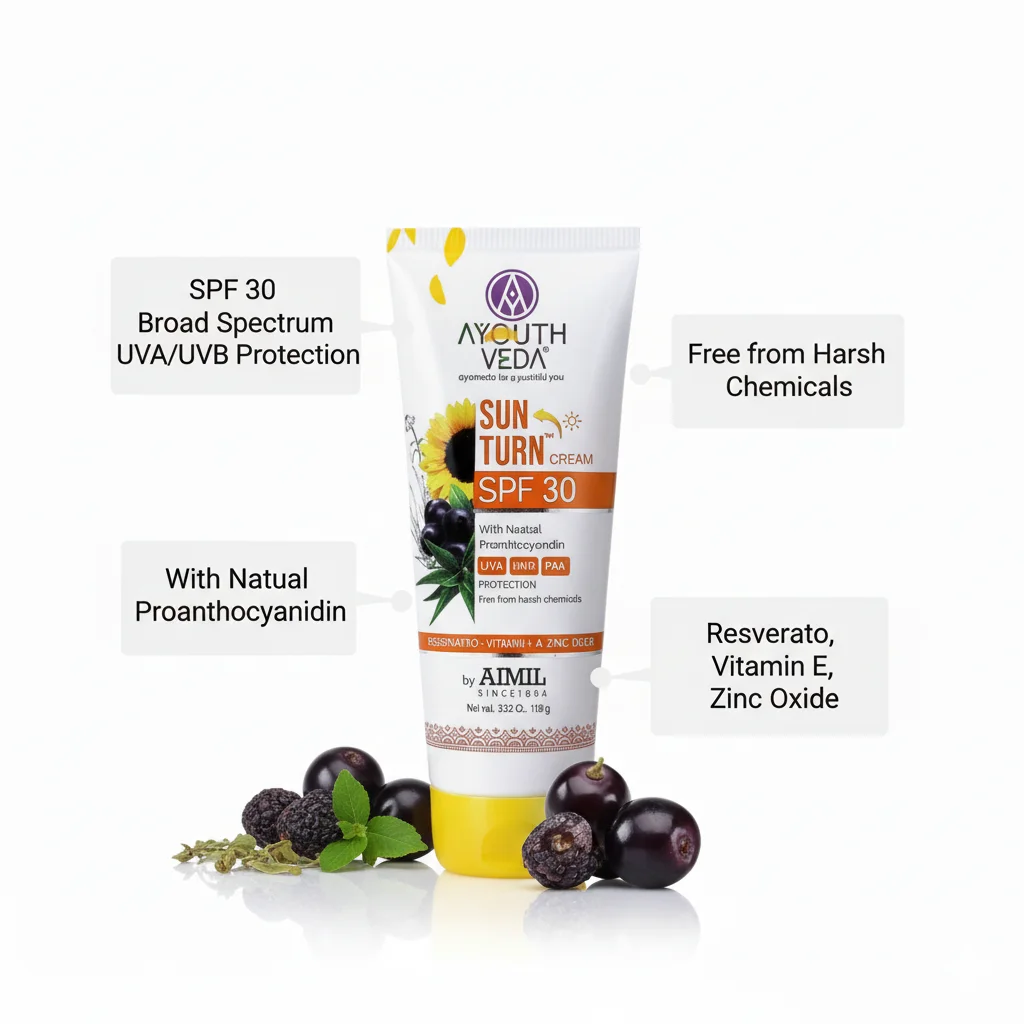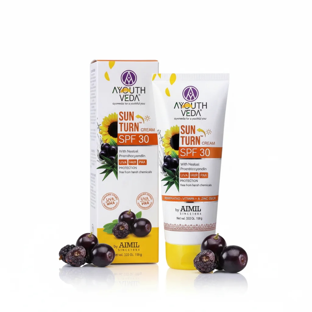 AYOUTH VEDA SUN TURN CREAM SPF 30 is an Ayurvedic sun protection cream designed to protect your skin from harmful UVA and UVB rays. The packaging highlights its formulation with “Nasturtium & Proanthocyanidin” as key ingredients. It boasts “360° UVA + UVB PA+++ PROTECTION” and is “FREE from harsh chemicals.” The design incorporates sunflowers and what appear to be dark berries, suggesting natural ingredients. The product is “by AIMIL SINCE 1984,” indicating a brand with a history in Ayurvedic products. It comes in a tube containing 100g (or 3.52 Oz.) of product and is presented with its outer carton.
