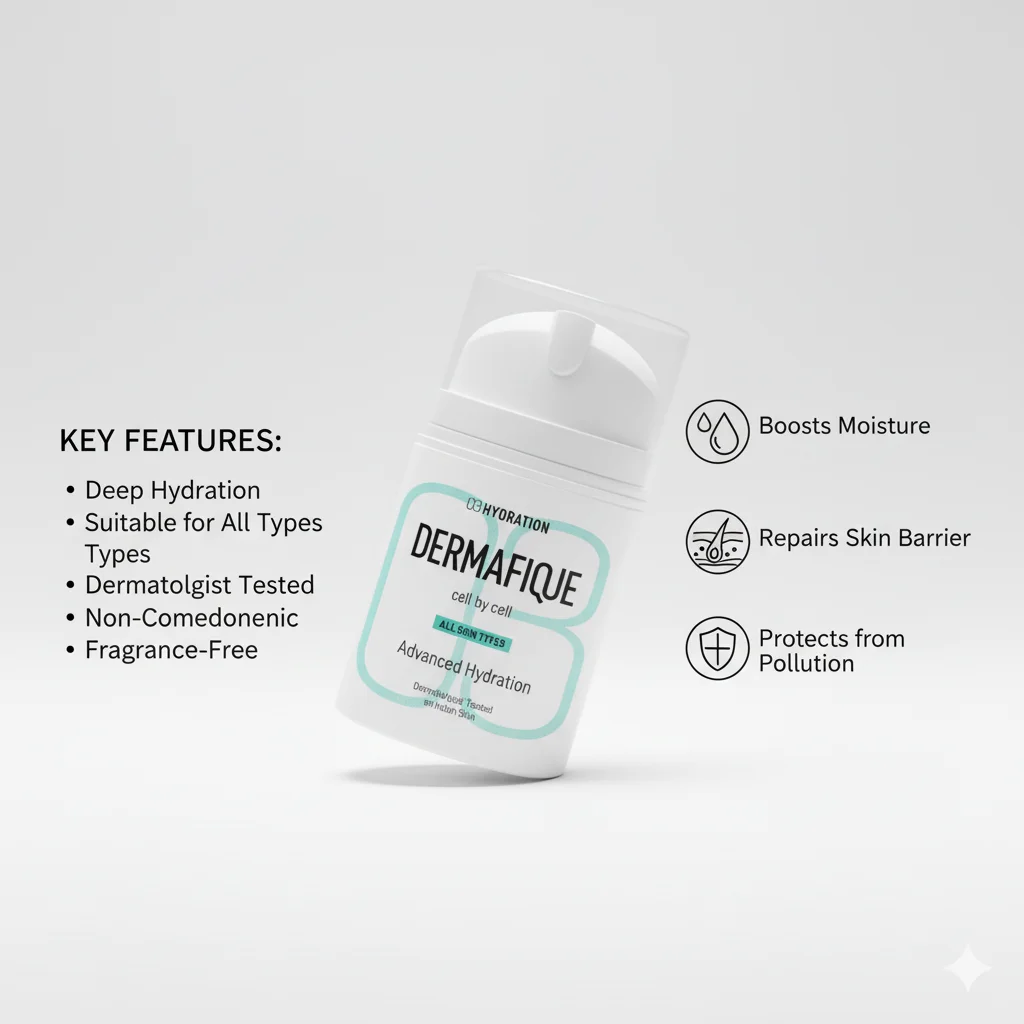 Dermafique Advanced Hydration is a skincare product designed to provide intense moisture to all skin types. The packaging features a clean, minimalist design with a white bottle and box, accented by a refreshing teal color. The product comes in a pump dispenser bottle, suggesting a hygienic and easy-to-use application. It emphasizes “cell by cell” hydration, implying a deep and thorough moisturizing action. The formula is specifically noted as “Dermatologist Tested on Indian Skin,” indicating its suitability and efficacy for a diverse range of skin tones and conditions.