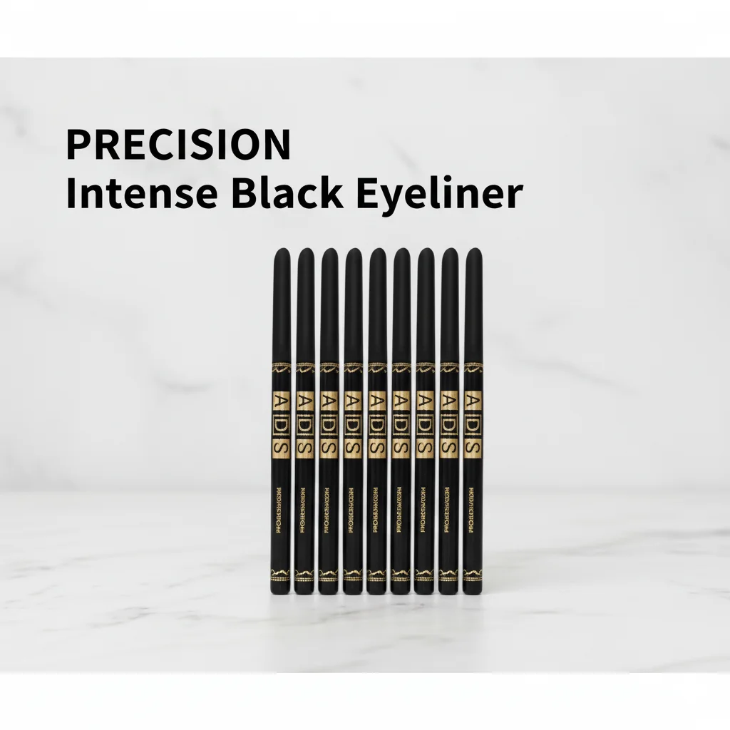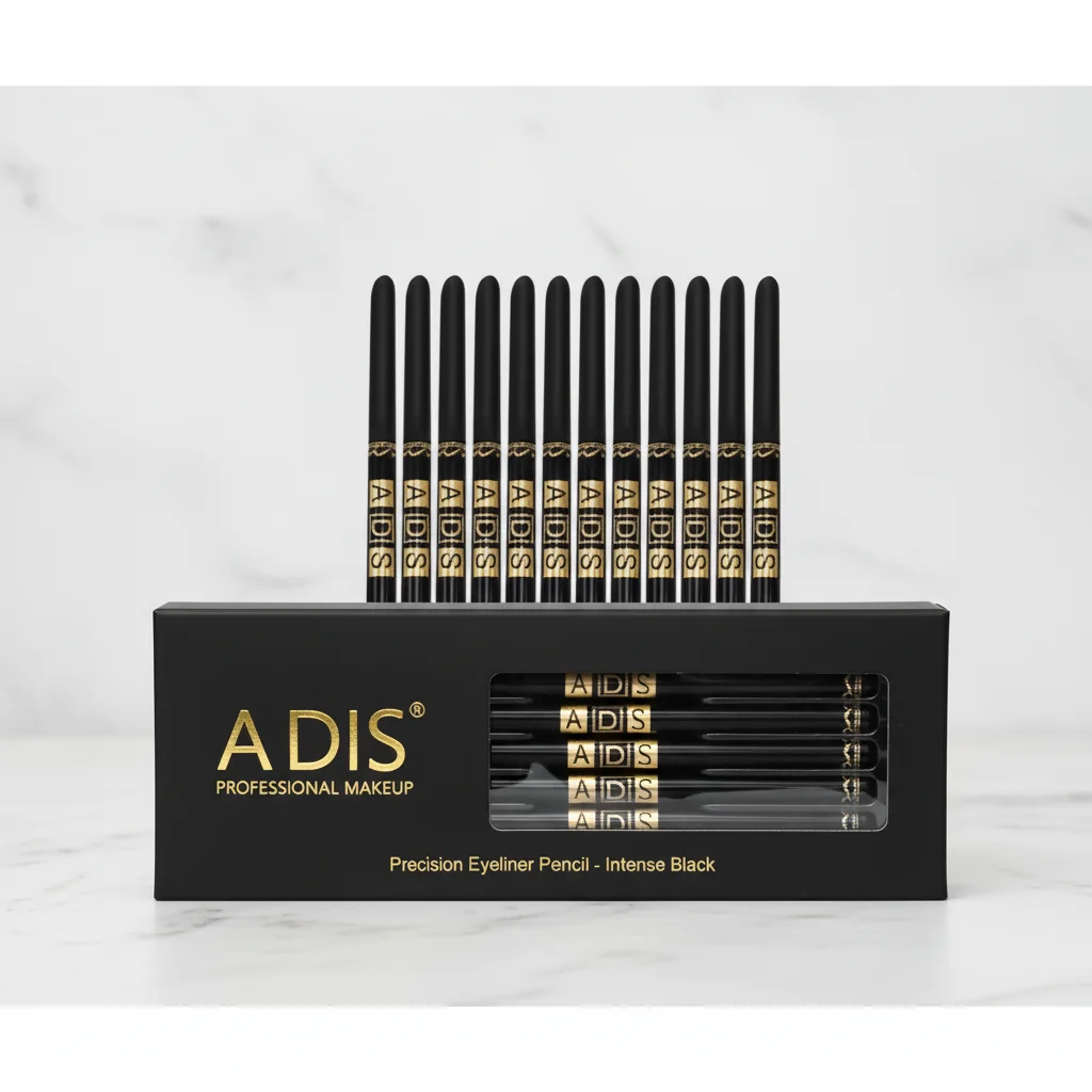 This product features a display box containing 12 individual “ADIS Professional Makeup Precision Eyeliner Pencils” in “Intense Black.” The packaging is sleek and professional, with a matte black finish and elegant gold lettering. The brand name “A DIS” with its registered trademark symbol is prominently displayed on the front of the box, along with “PROFESSIONAL MAKEUP.” Below that, the product type is clearly stated as “Precision Eyeliner Pencil – Intense Black.”