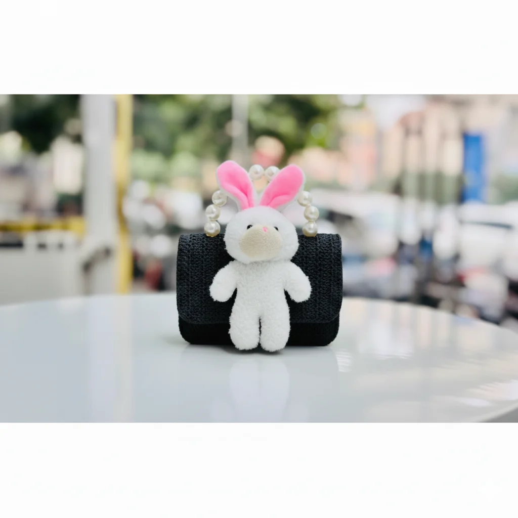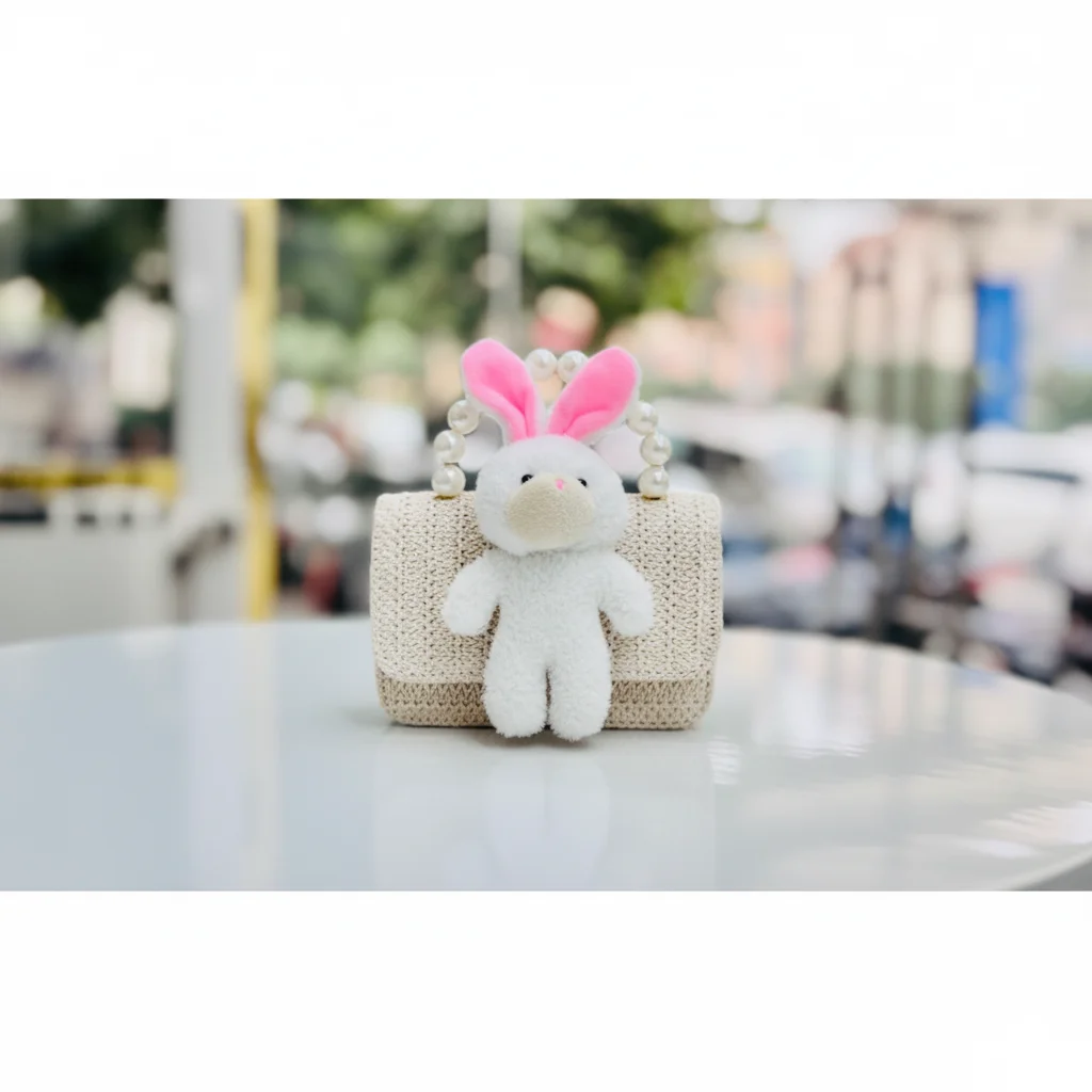 Adorable Plush Bunny Mini Handbag- Woven Purse with Elegant Faux Pearl Handle for Girls & Teens