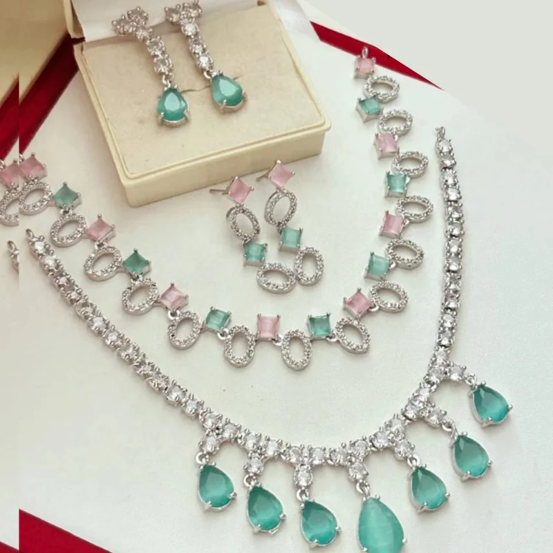 Hued American Diamond (AD) Stud Earrings & Crystal Beaded String Combo Set