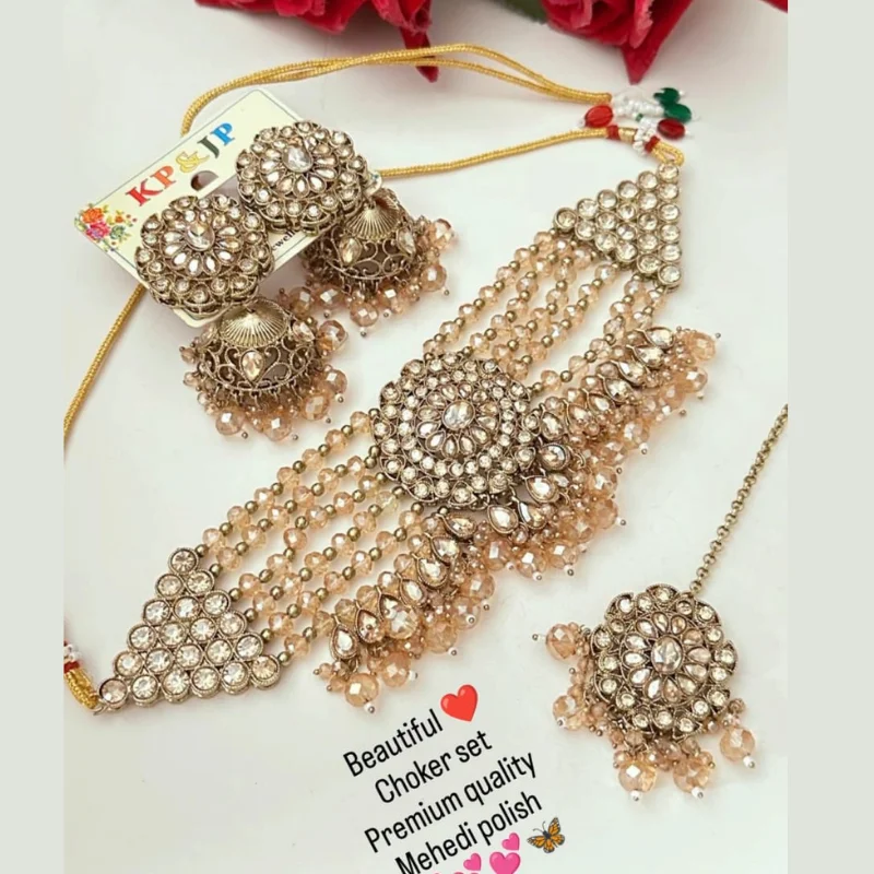 Antique Gold “Mehndi Polish” Kundan Choker Set with Jhumka Earrings & Maang Tikka