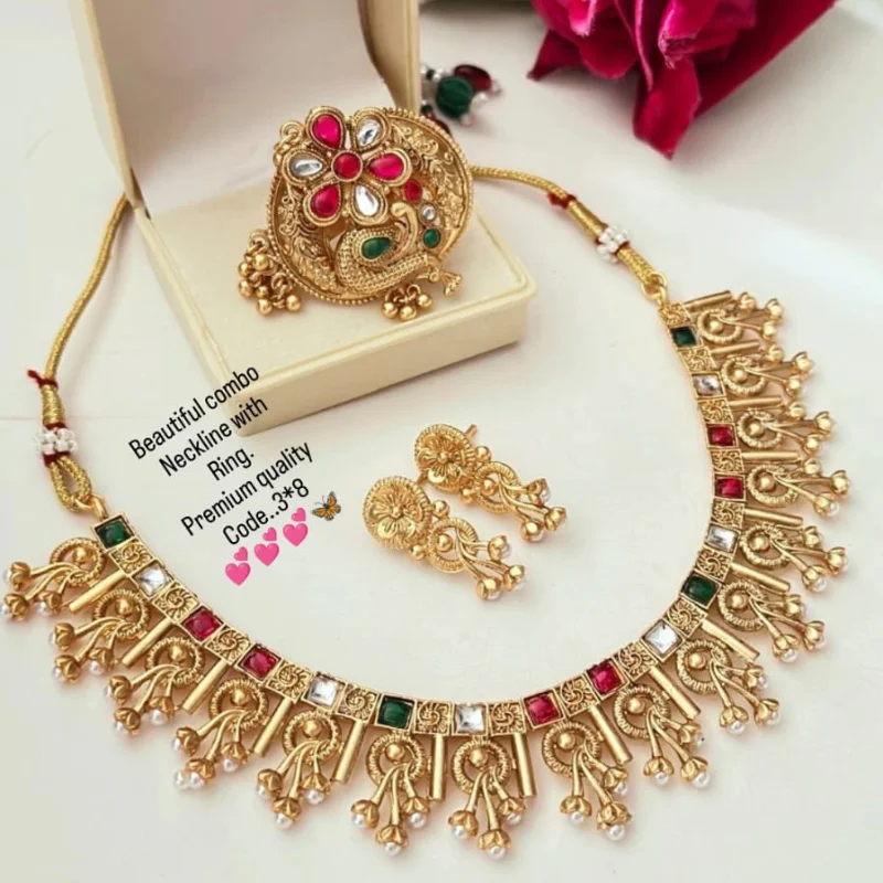 3-Piece Festive Combo: Includes 1 Choker Necklace, 1 Pair of Earrings, and 1 Large Statement Finger Ring.