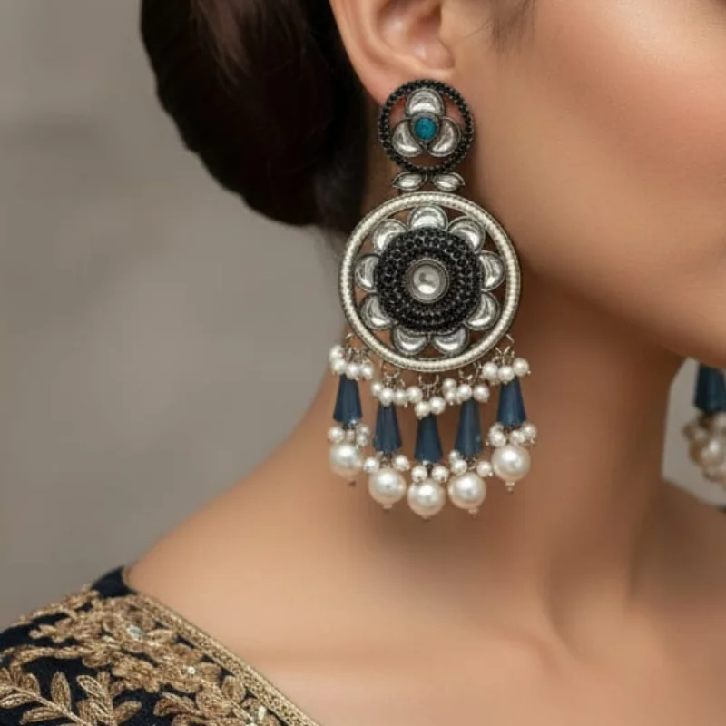 Styling Tip: Best paired with navy blue, gold, or black ethnic outfits to highlight the unique blue and silver tones of the earrings.