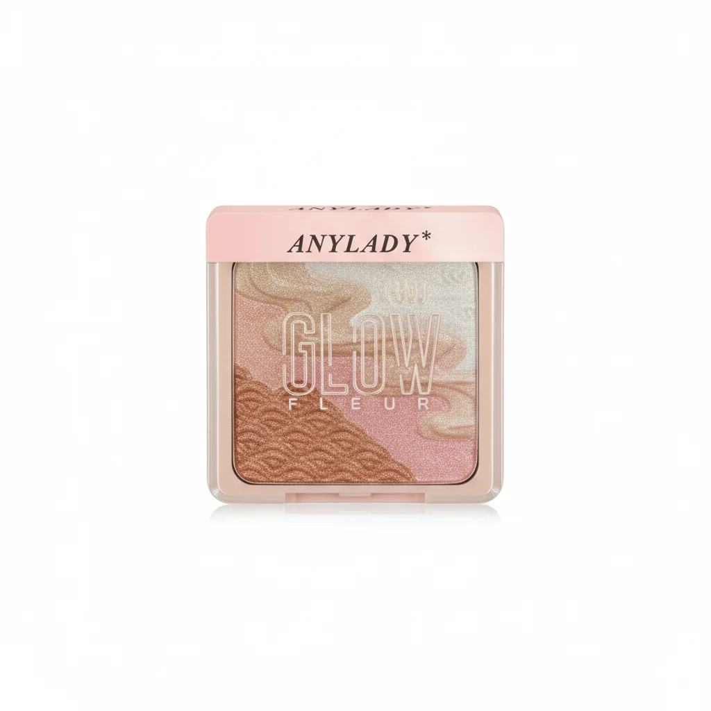 This product is an ANYLADY Glow Fleur Highlight Palette, presented in a compact, square-shaped case with a soft pink lid. The palette features a striking design with three distinct, wavy-patterned shades: a shimmery white/champagne, a warm golden bronze, and a delicate rose gold or pink-toned highlighter. The word “GLOW” is prominently debossed into the product pans, emphasizing its purpose. Below “GLOW,” the word “FLEUR” is also visible, suggesting a floral or delicate aesthetic. This palette is designed to add radiance and dimension to the face, allowing users to achieve a luminous finish. The variety of shades indicates versatility, suitable for different skin tones or for creating varied highlighting effects.