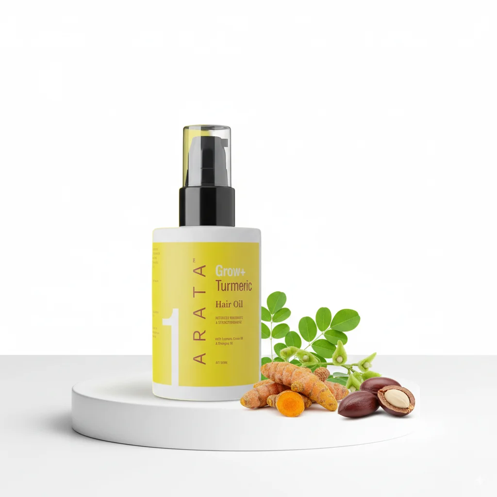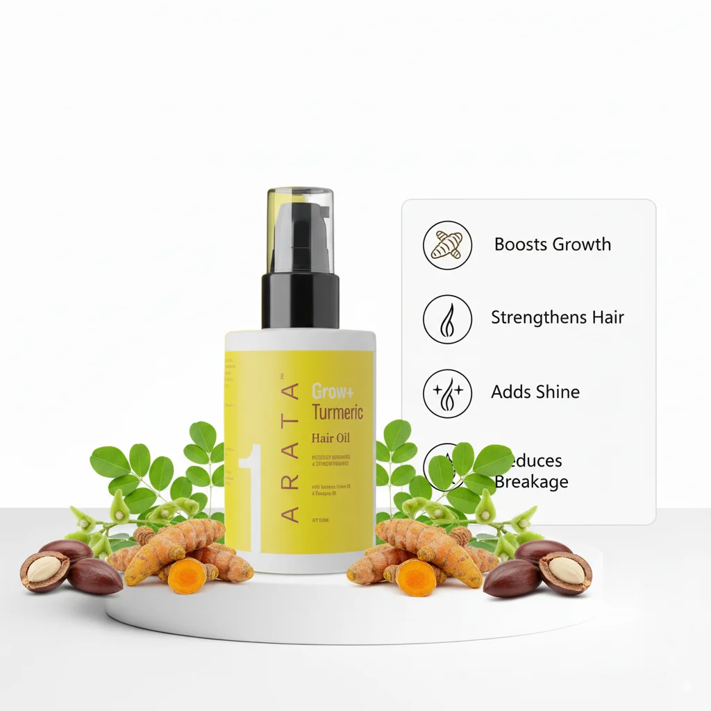 This is a natural hair oil designed to promote healthy hair growth. The product comes in a sleek pump bottle with a bright yellow label. It highlights the use of turmeric along with other nourishing botanicals such as moringa leaves and natural oils. The ingredients shown in the image include turmeric roots, moringa leaves, and seeds, suggesting the formulation is enriched with natural extracts to strengthen and revitalize hair.