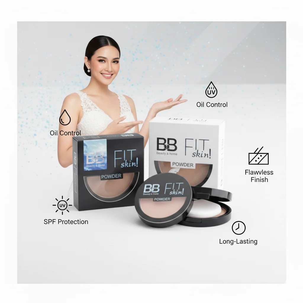 The BB FIT skin! Pressed Powder by Beauty & Home is a compact face powder designed for on-the-go application or touch-ups. It comes in a sleek, round black compact with the brand logo prominently displayed. The powder itself is a light to medium skin tone shade, suggesting it’s designed to blend seamlessly with various complexions for a natural finish. The packaging also includes a square cardboard box, indicating a complete retail product. The design is modern and clean, aiming for a professional yet accessible aesthetic.