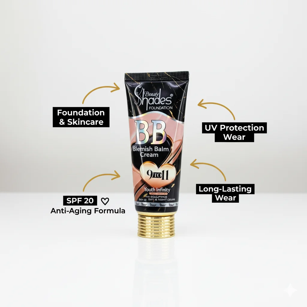 The Beauty Shades Youth Infinity BB Blemish Balm Cream (9 to 11) is a multi-functional beauty product that serves as a day and night cream with skin-sculpting properties, while also providing light coverage. The “9 to 11” possibly indicates a specific shade or a benefit level. As a BB cream, it aims to combine the benefits of skincare (like moisturizing, anti-aging, or nourishing) with makeup properties (like evening out skin tone and concealing minor blemishes). It also includes SPF 20, offering a degree of sun protection. This product is designed for those seeking a simplified beauty routine that provides both skin treatment and a natural-looking complexion.