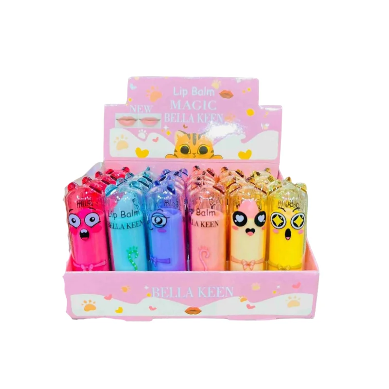 This is a set of “Magic Lip Balms” by Bella Keen, presented in a retail display box. The lip balms come in a variety of vibrant colors (pink, blue, purple, peach, yellow) and are housed in tubes designed with cute, stylized character faces, featuring elements like animal ears or playful expressions. The packaging suggests a fun, whimsical, and possibly color-changing or tinting effect, typical of “magic” lip balms. The display box itself is pink with cat-themed graphics, including paws and a cat peeking over the edge, along with “Lip Balm MAGIC” and “BELLA KEEN” branding. The overall aesthetic targets a younger demographic interested in colorful and playful beauty products.