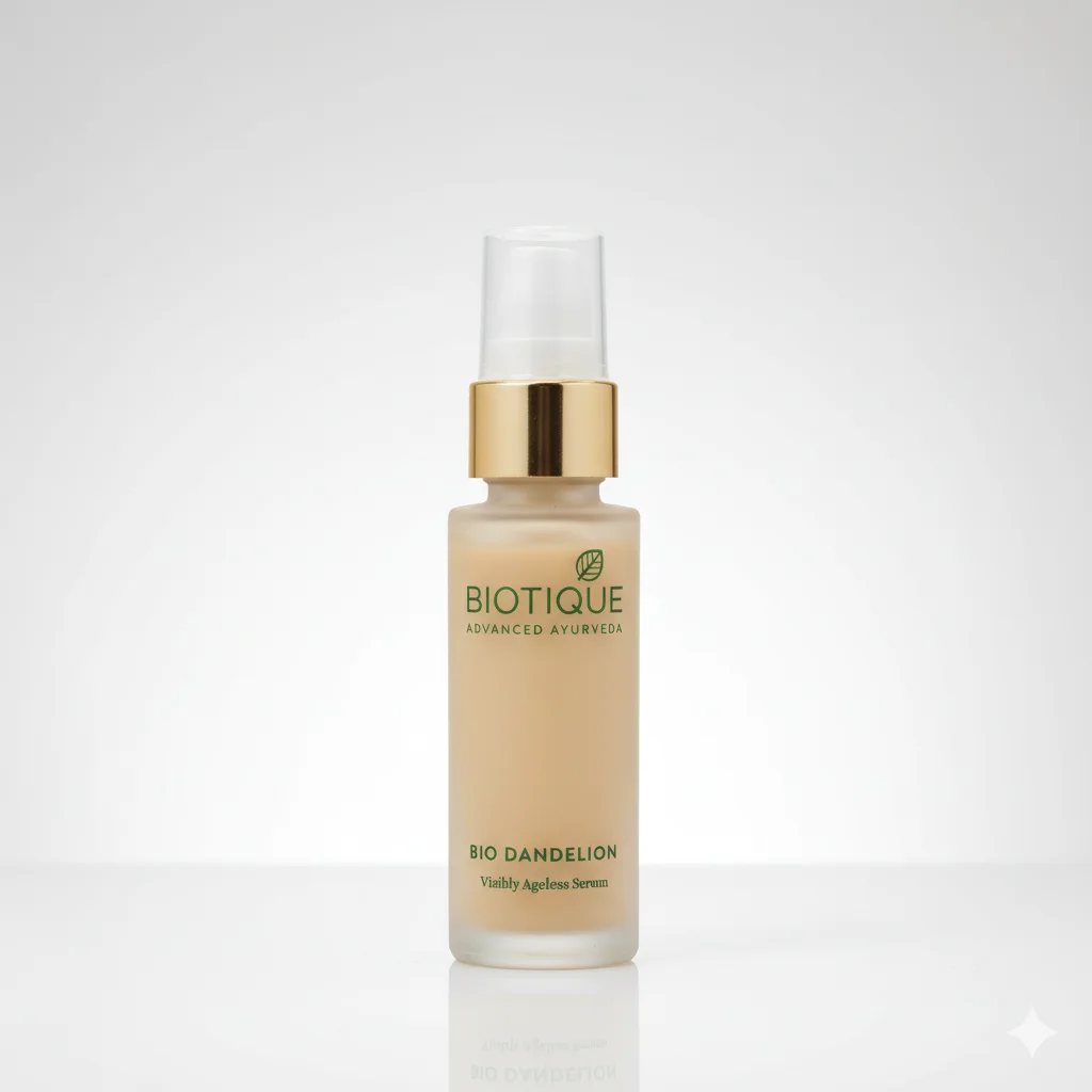 The Biotique Bio Dandelion Visibly Ageless Serum is an advanced Ayurvedic formulation designed to help reduce the appearance of aging. This serum is likely enriched with dandelion extract, known for its beneficial properties in skincare, aiming to promote a more youthful and radiant complexion. It comes in a frosted glass bottle with a gold pump dispenser, suggesting a premium and effective product for visible anti-aging results.