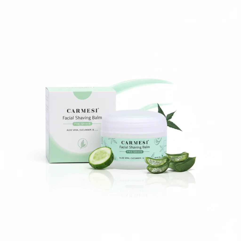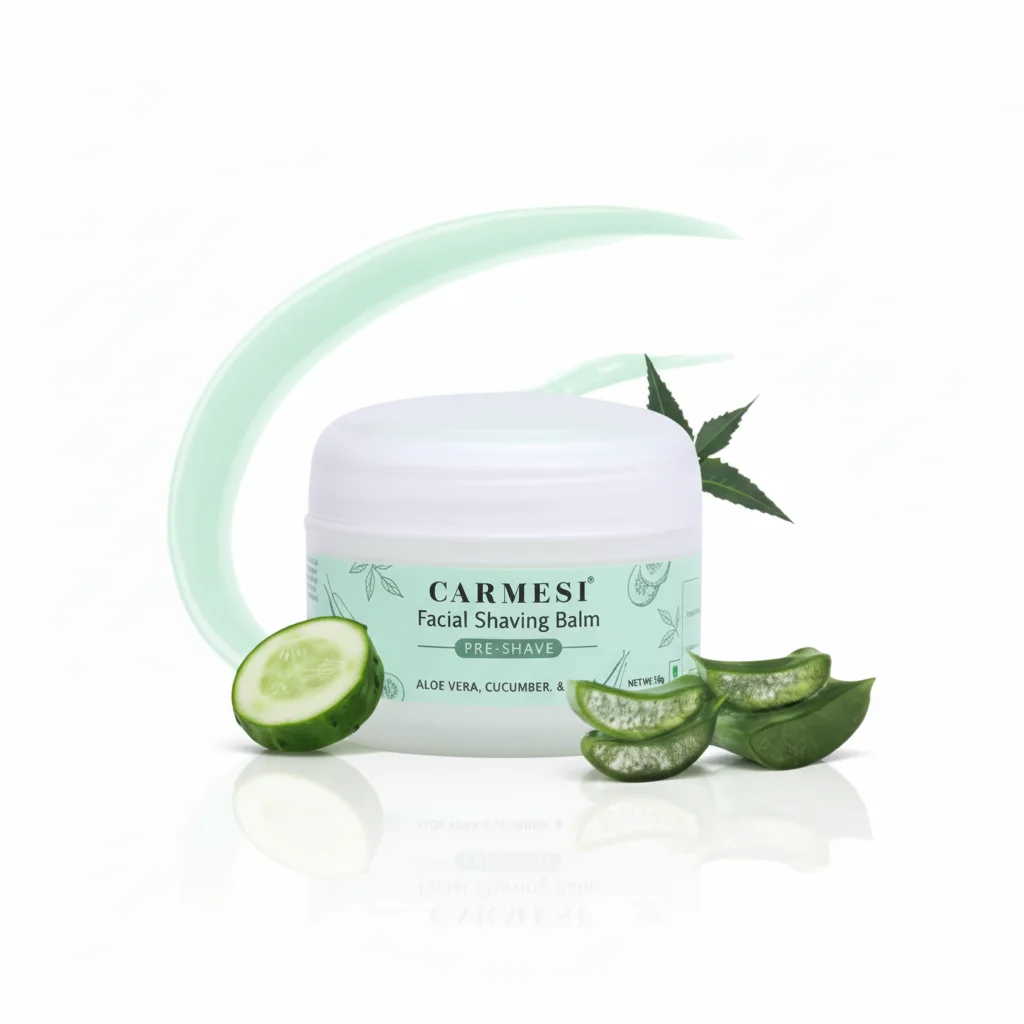 Carmesi Facial Shaving Balm Pre Shave is a skincare product designed to prepare the skin for shaving, aiming to enhance the shaving experience and protect the skin. It comes in a tub or jar, suggesting a creamy or balm-like consistency. The product highlights its natural ingredients, specifically Aloe Vera, Cucumber, and Vitamin E, which are known for their soothing, hydrating, and antioxidant properties. The image features fresh cucumber and aloe vera plant parts, reinforcing these natural components. A male brand ambassador, Rohan Singh, is shown holding the product, indicating its target audience. The balm is intended to be applied before shaving to soften the skin and hair, reduce friction, and prevent common shaving irritations.