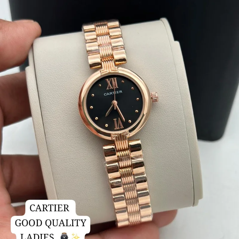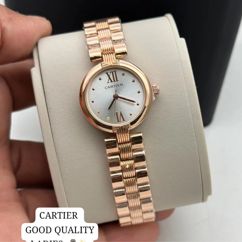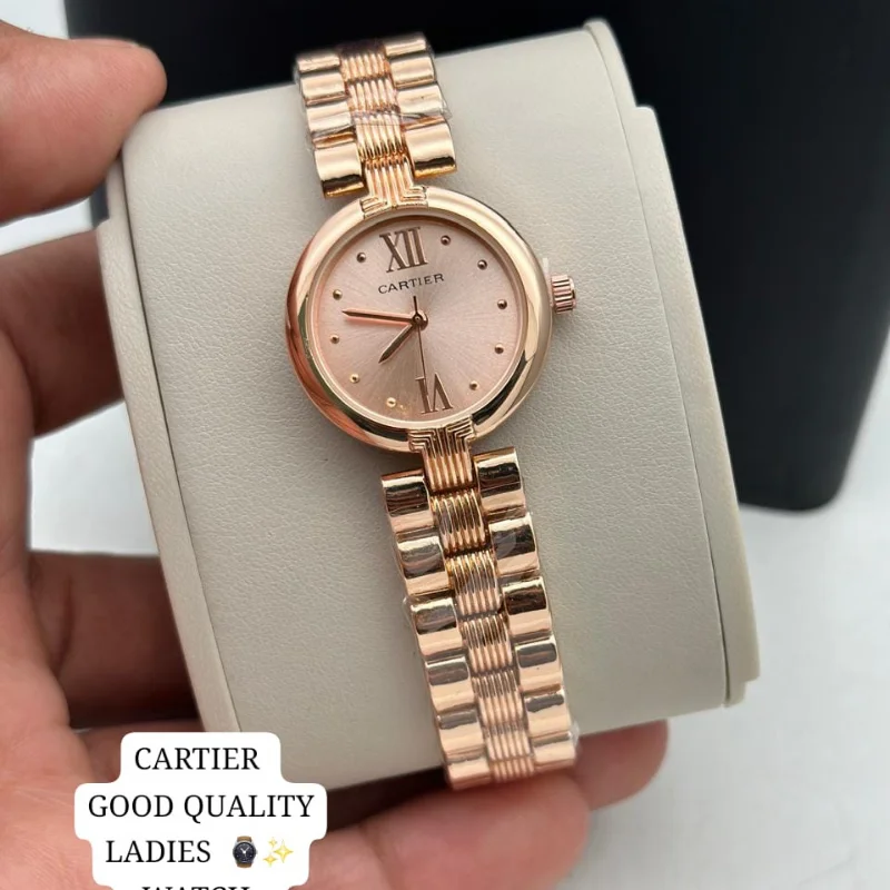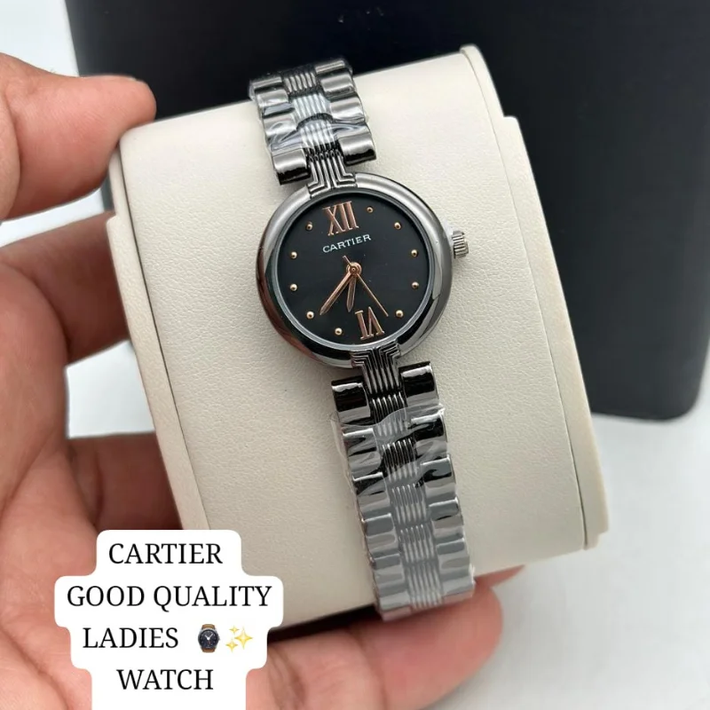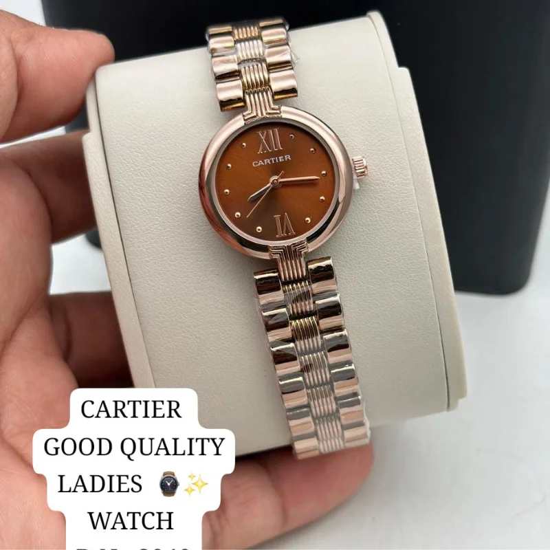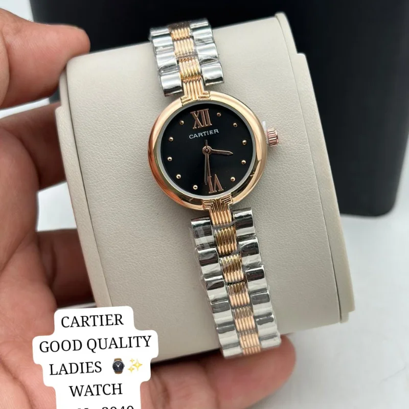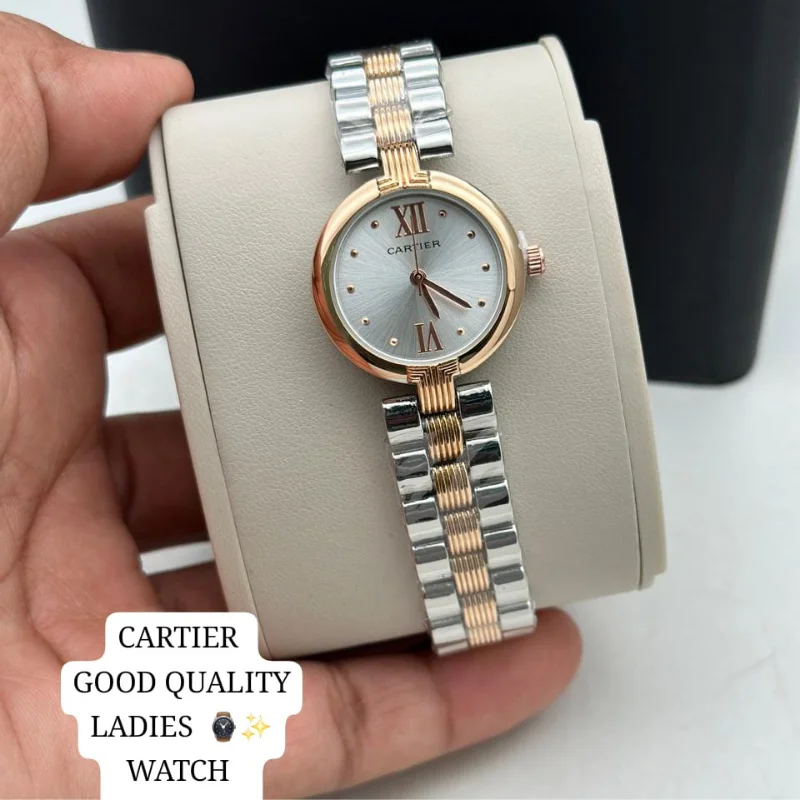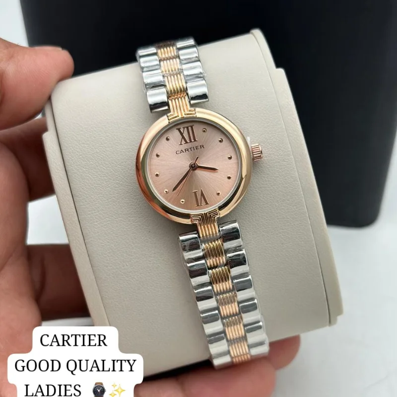 The watch is fitted with a versatile five-row “beads-of-rice” style bracelet that seamlessly integrates polished silver and rose gold-tone links, creating a fluid, jewelry-like finish that contours comfortably to the wrist. Equipped with a reliable quartz movement and iconic sword-style hands, this “good quality” fashion watch is a refined choice for those who appreciate the timeless elegance of the Cartier aesthetic in a versatile, everyday accessory.