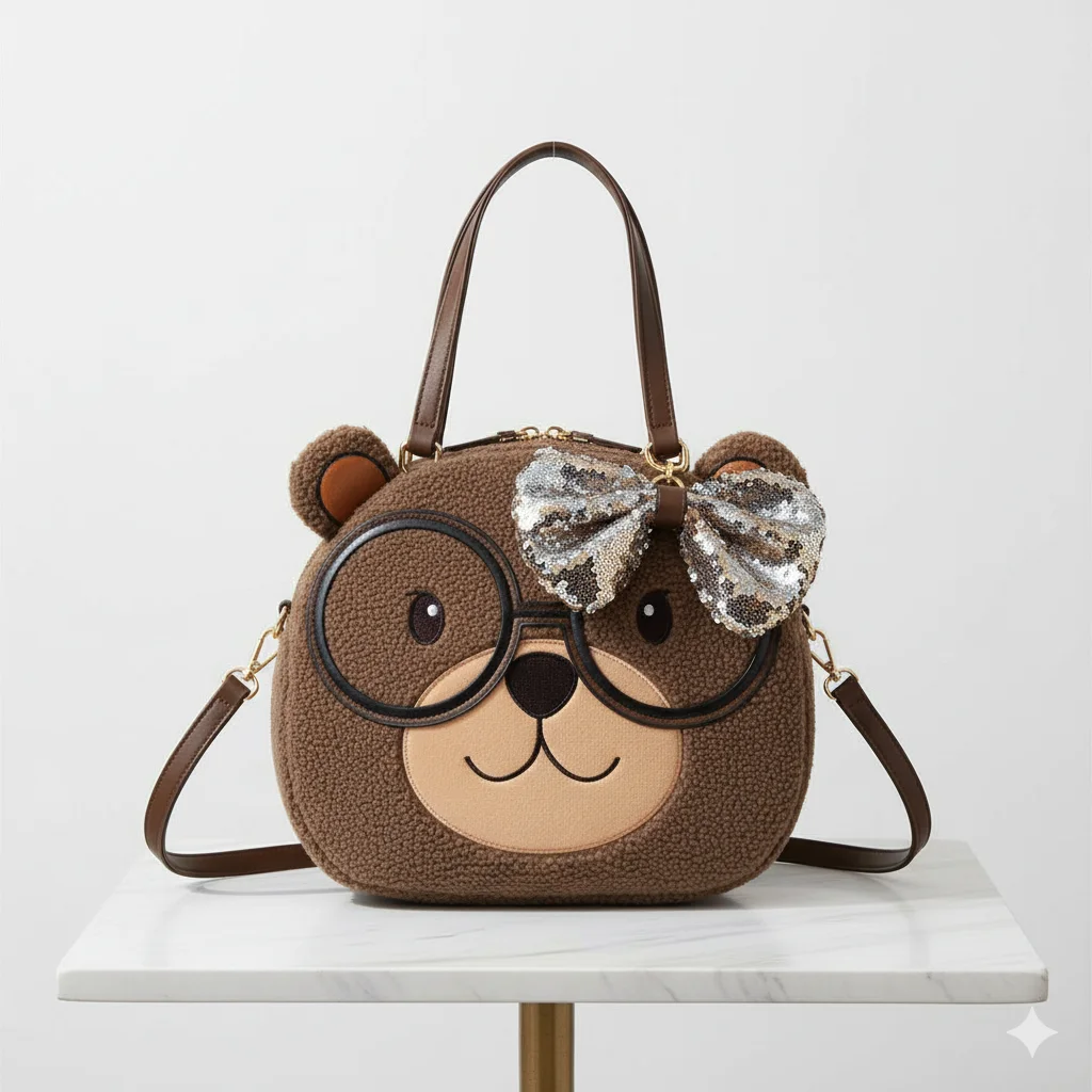 Charming “Bookworm Bear” Faux Shearling Handbag with Glasses & Sequin Bow