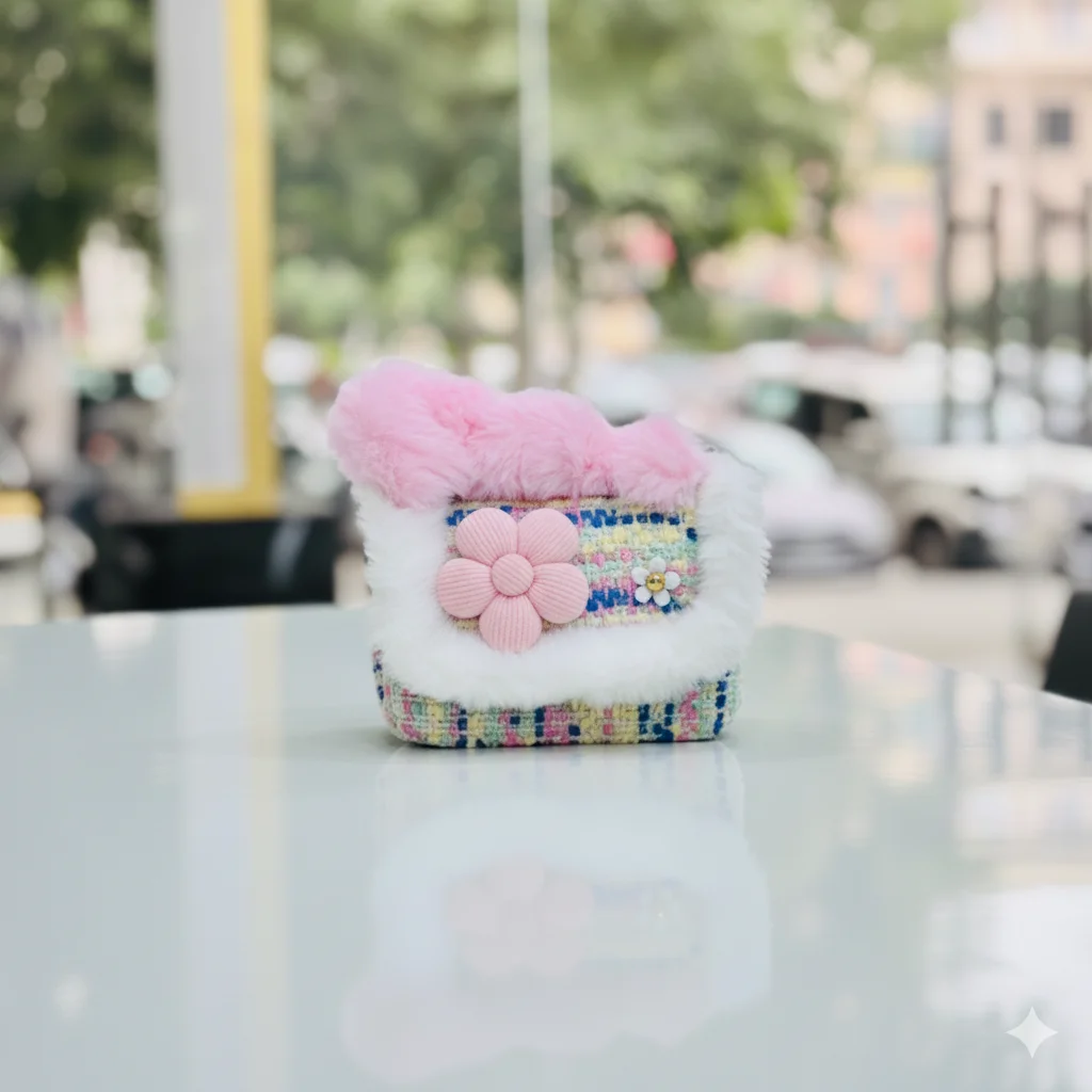 Charming Pastel Tweed Mini Handbag with Floral Accent & Pink Fur Handle
