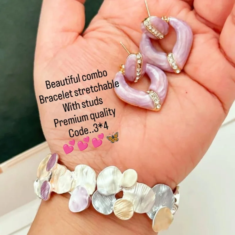 Chic & Mixed-Metal Combo Set: Stretchable Petal Bracelet with Crystal-Accented Marble Hoop Studs