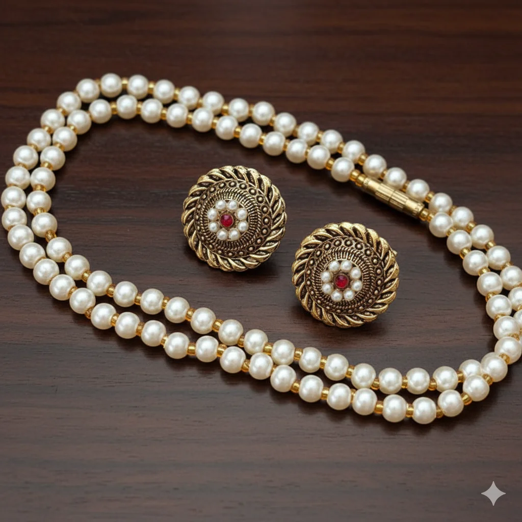 Elevate your jewelry collection with this timelessly elegant Pearl and Antique Gold Necklace Set. This exquisite ensemble strikes the perfect balance between traditional charm and contemporary sophistication.