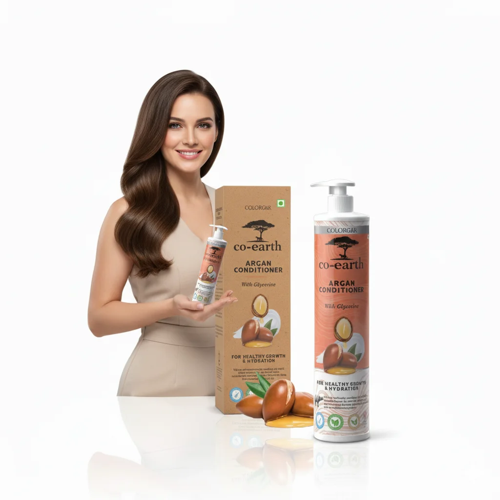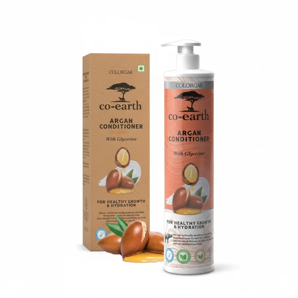Co-earth Argan Conditioner with Glycerine is a hair care product designed to promote healthy hair growth and hydration. Formulated with argan oil, known for its nourishing properties, and glycerine, a powerful humectant, this conditioner aims to deeply moisturize and strengthen hair strands. It helps to improve hair’s overall health, leaving it softer, shinier, and more manageable. The product comes in a generous pump bottle for easy dispensing and a smaller travel-sized bottle, indicating its suitability for regular use both at home and on the go. The packaging highlights natural ingredients like argan nuts, emphasizing a focus on natural benefits for hair.