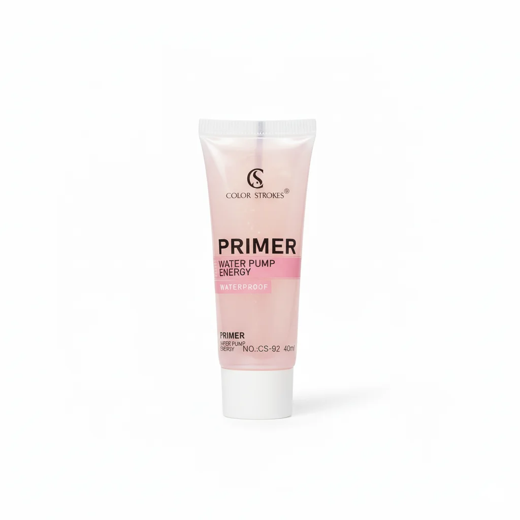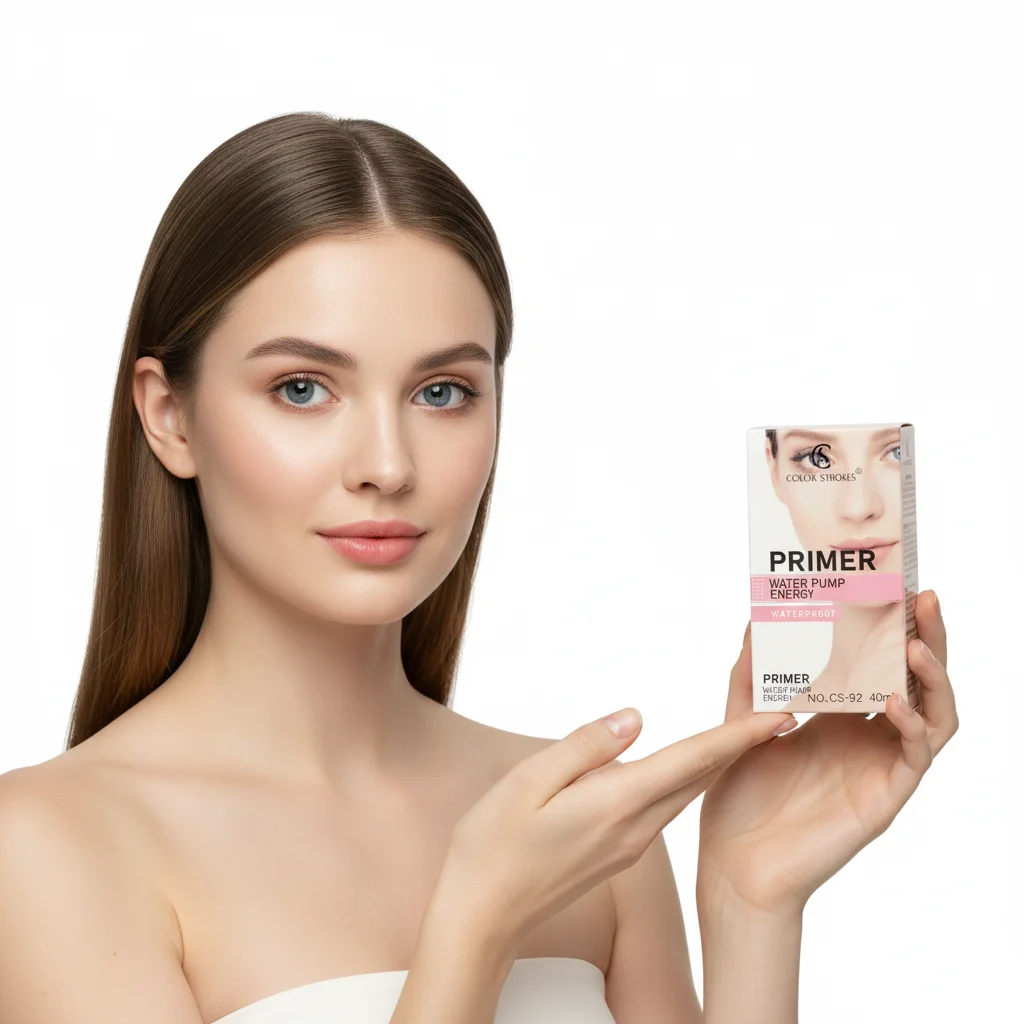 The product is a “Primer” from the brand “COLOR STROKES,” specifically labeled as “Water Pump Energy.” The packaging suggests it’s a makeup primer designed to prepare the skin for foundation and other cosmetics. A significant feature highlighted is “WATERPROOF,” indicating its ability to resist water and likely extend the wear of makeup. The box displays a close-up image of a woman’s face, focusing on her eyes and lips, which is typical for beauty products. Details like “NO.:CS-92” and “40ml” are present, indicating a product code and volume, respectively. The overall design is clean and professional, with a pink accent color complementing the white background.