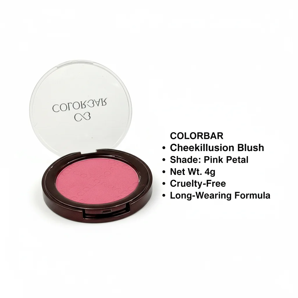 The COLORBAR Cheekillusion Blush in Pink Petal is a compact powder blush designed to add a natural flush of color to the cheeks. It comes in a circular, dark-colored compact with a clear lid, allowing the shade to be visible. The blush itself is a vibrant pink, pressed into a pan. The formula is described as long-wearing and is cruelty-free, meaning it has not been tested on animals. Each compact contains 4 grams of product.