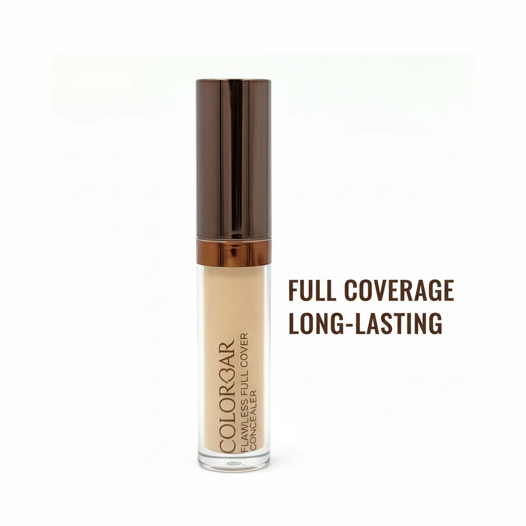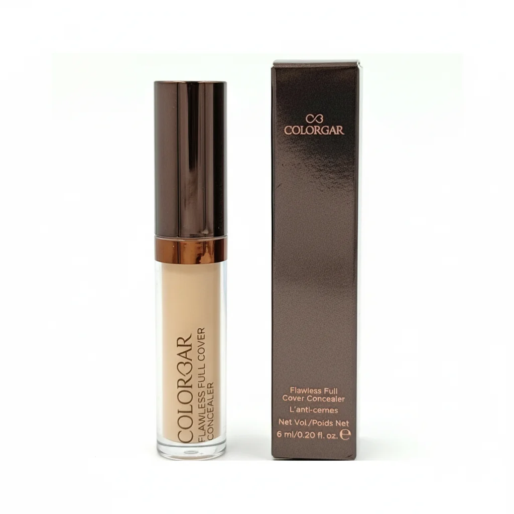 This image displays a Colorbar Flawless Full Cover Concealer. The product itself is housed in a clear cylindrical tube, allowing the light-beige shade of the concealer to be visible. The tube features a dark brown, metallic-looking cap, suggesting an applicator is contained within. The brand name “COLORGAR” and the product name “FLAWLESS FULL COVER CONCEALER” are printed vertically on the side of the tube in a bold, metallic font. Alongside the concealer tube is its corresponding rectangular cardboard box, matching the dark brown color of the cap. The box prominently features the “C3 COLORGAR” logo at the top, and below that, it specifies “Flawless Full Cover Concealer,” “L’anti-cernes” (French for concealer), and “Net Vol. / Poids Net: 6 ml / 0.20 fl. oz.”, indicating its volume. The overall presentation is sleek and professional, characteristic of a high-quality cosmetic product.