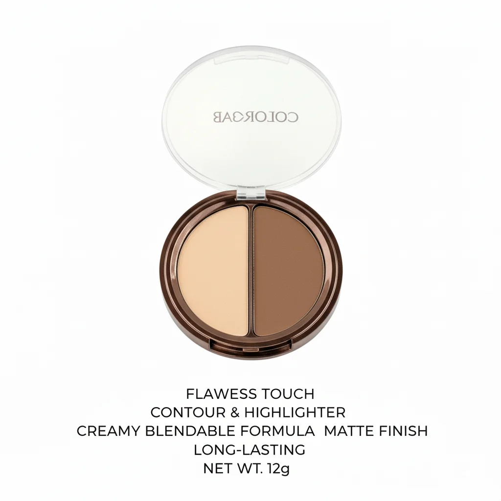 This image features a Colorbar Flawless Touch Contour & Highlighter Kit, displayed both in its open compact form and with its accompanying packaging. The kit itself is a round, brown compact with a clear lid, revealing two distinct pans of powder: one in a lighter, creamy beige shade for highlighting, and another in a deeper, warm brown shade for contouring. The clear lid of the compact has the brand name “COLORGAR” mirrored on its inner surface. Beside the open compact is its original rectangular brown cardboard box, which also bears the “C3 COLORGAR” logo. Text on the box clearly states “Flawless Touch Contour & Highlighter Kit” and “Net WT: 12g / Poids Net: 0.42 us. oz.”, indicating the product type and its net weight. The design is sleek and practical, typical of makeup products designed for enhancing facial features.