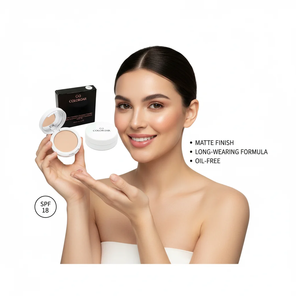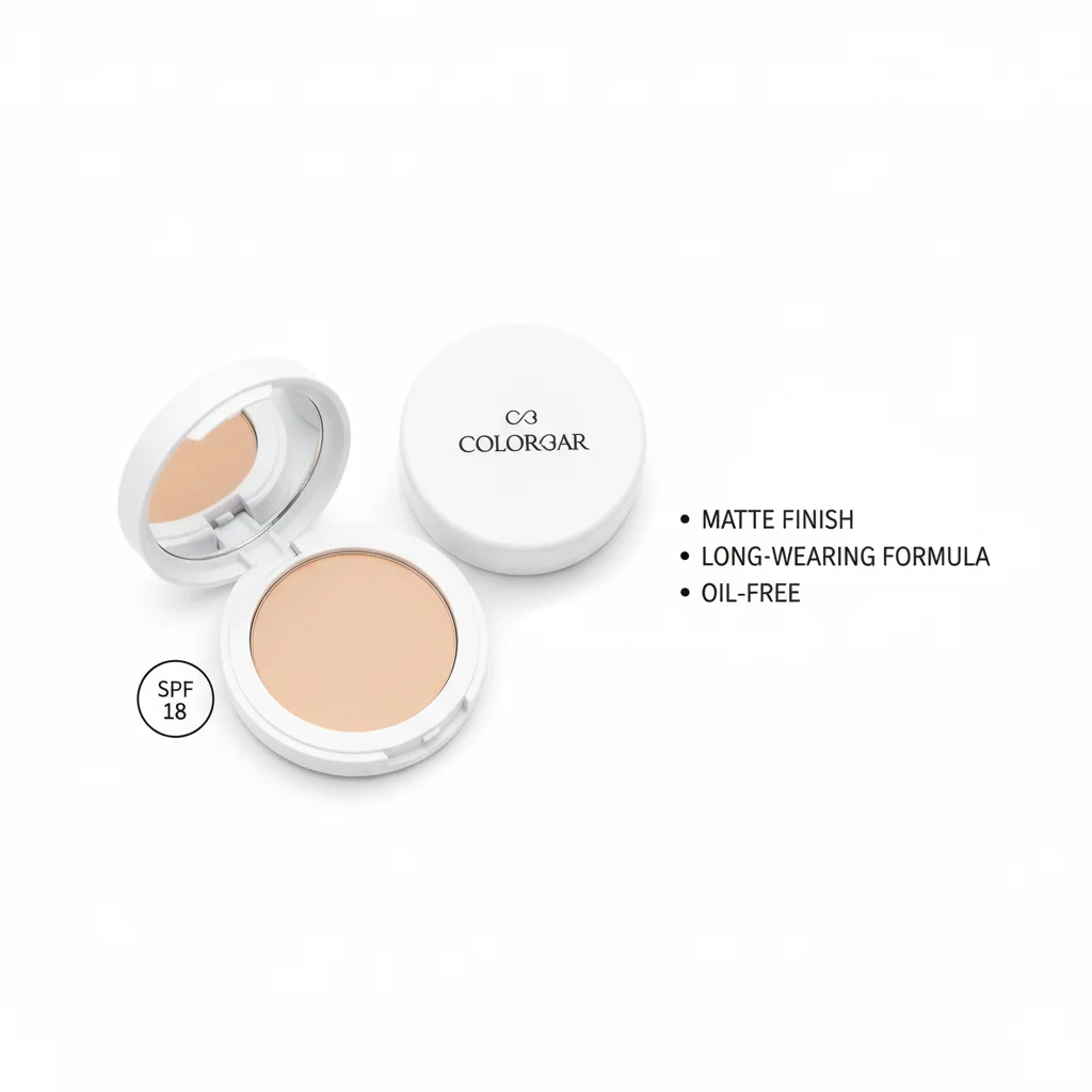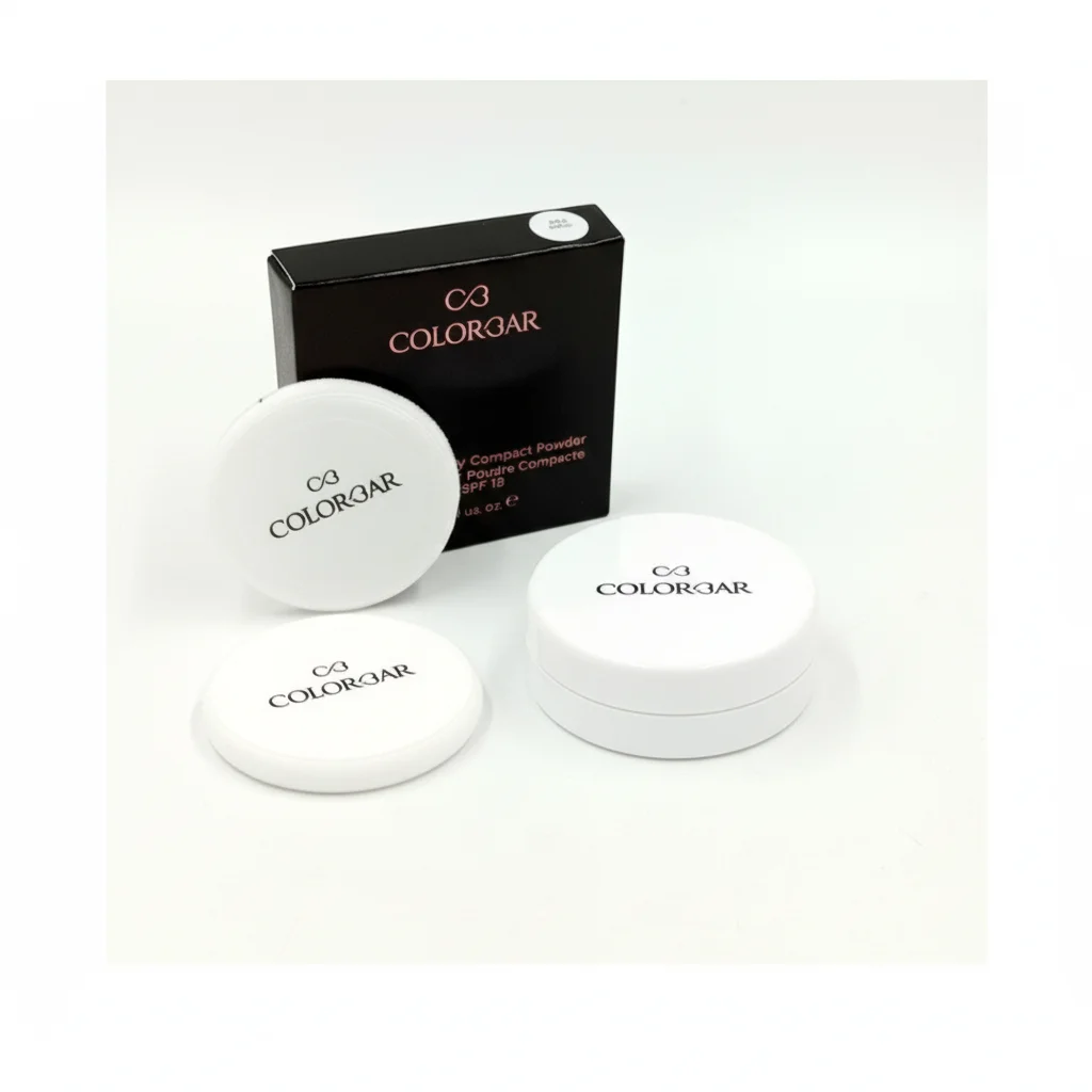 This image showcases the Colorbar Radiant White Compact Powder with SPF 18. The product consists of a round, white compact case with its lid removed and placed beside it, revealing the pressed powder inside. The lid, as well as the base of the compact, prominently features the “C3 COLORGAR” logo in a subtle gray. Next to the compact is its original black cardboard box, also displaying the “C3 COLORGAR” logo at the top. The box provides key product details, including “Compact Powder,” “SPF 18,” and “us. oz.” (though the specific weight is partially obscured). The overall presentation is clean and bright, emphasizing the “Radiant White” aspect, and the inclusion of SPF suggests sun protection benefits.
