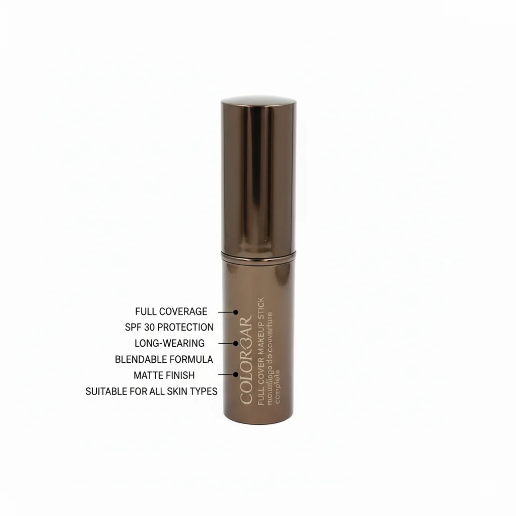 Next to the box, the makeup stick itself is a sleek, cylindrical design, matching the dark brown, metallic aesthetic of the packaging. The brand “COLORGAR” and the product name “FULL COVER MAKEUP STICK” (with French translation “maquillage de couverture complets”) are printed on the lower half of the stick. This format suggests a convenient and portable application, ideal for touch-ups or targeted full coverage.