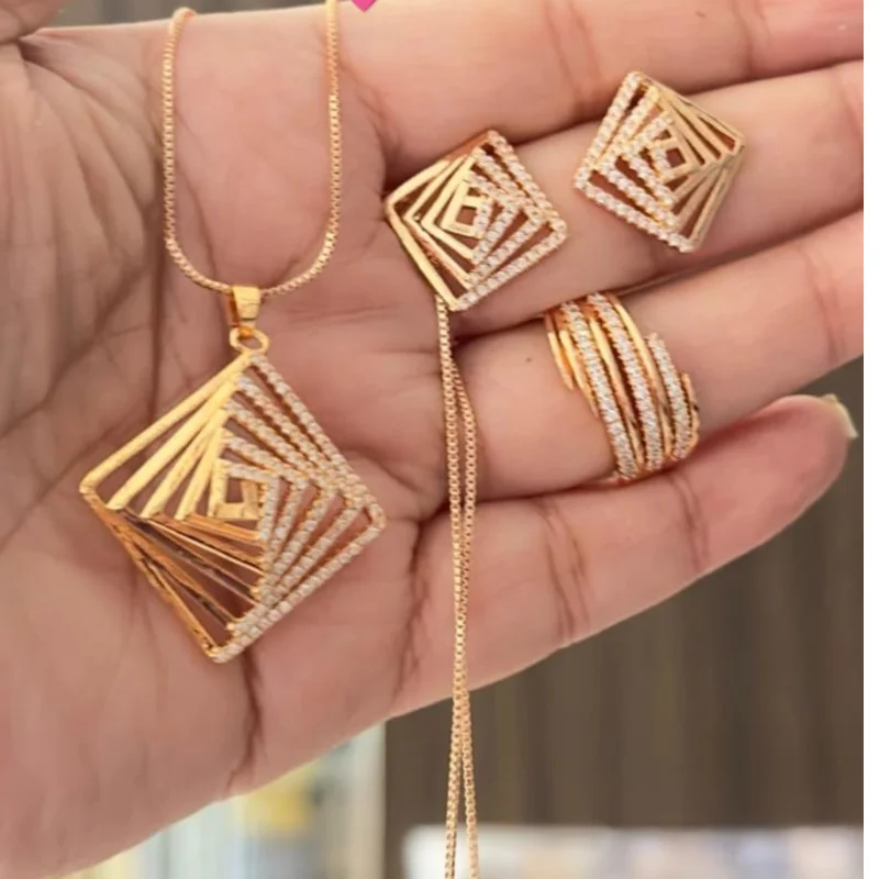 Complete 4-Piece Jewelry Collection: Includes one square spiral pendant, a matching gold-tone box chain, a pair of square stud earrings, and one multi-row statement ring.