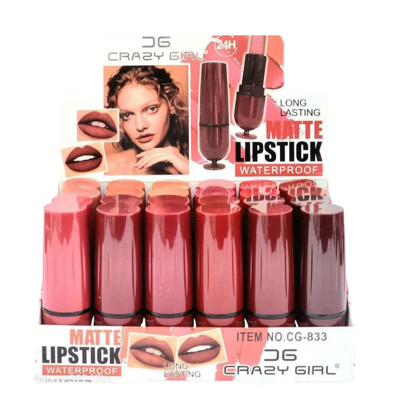 Experience enduring beauty with the “Crazy Girl” 24-hour Long-Lasting Matte Waterproof Lipstick. This product line emphasizes durability and a sophisticated finish, promising to stay put and maintain its matte appearance throughout the day. The packaging highlights “24H,” “Long Lasting,” “Matte,” and “Waterproof,” ensuring consumers of its high-performance qualities. The display features a model with a natural, yet striking look, showcasing a deep reddish-brown lip color. The individual lipstick tubes beneath the display appear to come in a range of warm, earthy tones, from lighter nudes to rich browns, catering to diverse preferences. This lipstick is perfect for those seeking a reliable, high-impact lip color that offers both style and stamina.