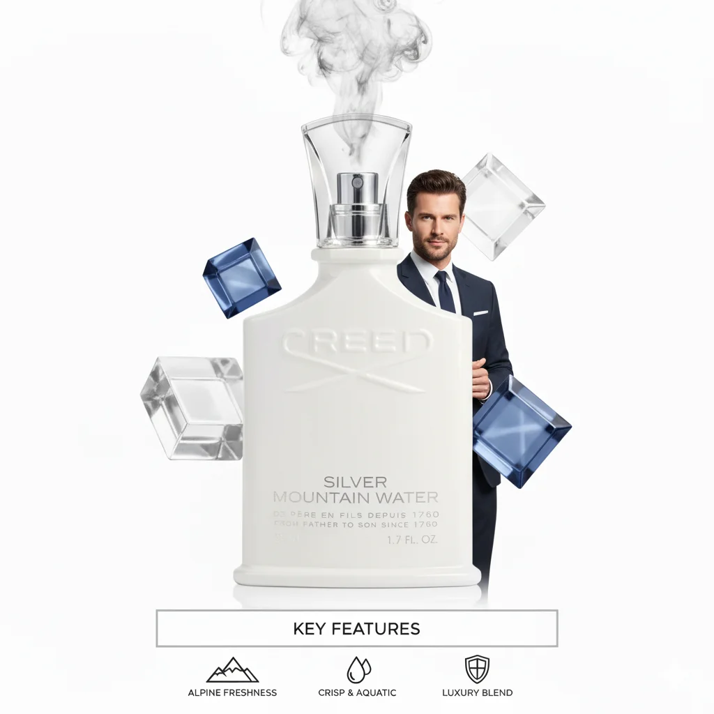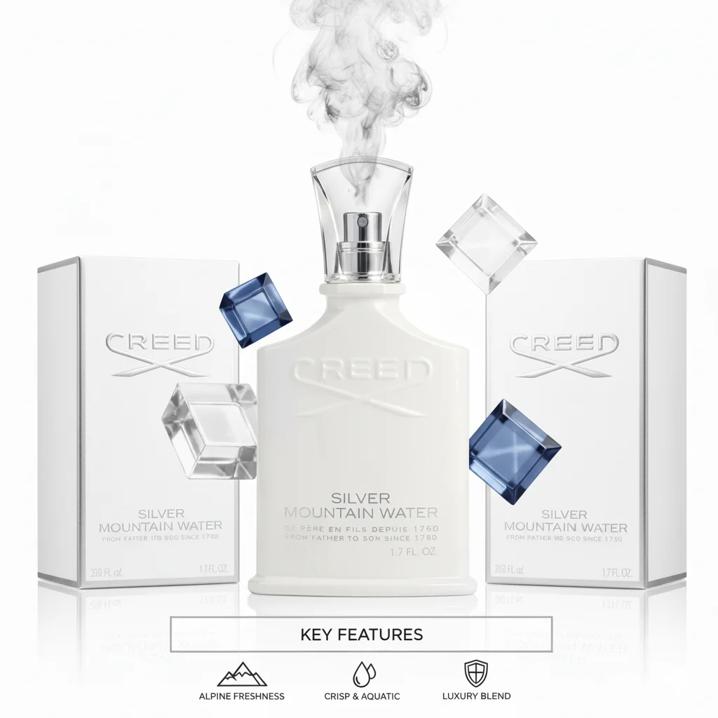 Bottle Design: The iconic Creed flask bottle in opaque white, symbolizing snow-capped mountains and pristine purity, with a clear cap and reflective accents. The packaging often features a silver foil logo.