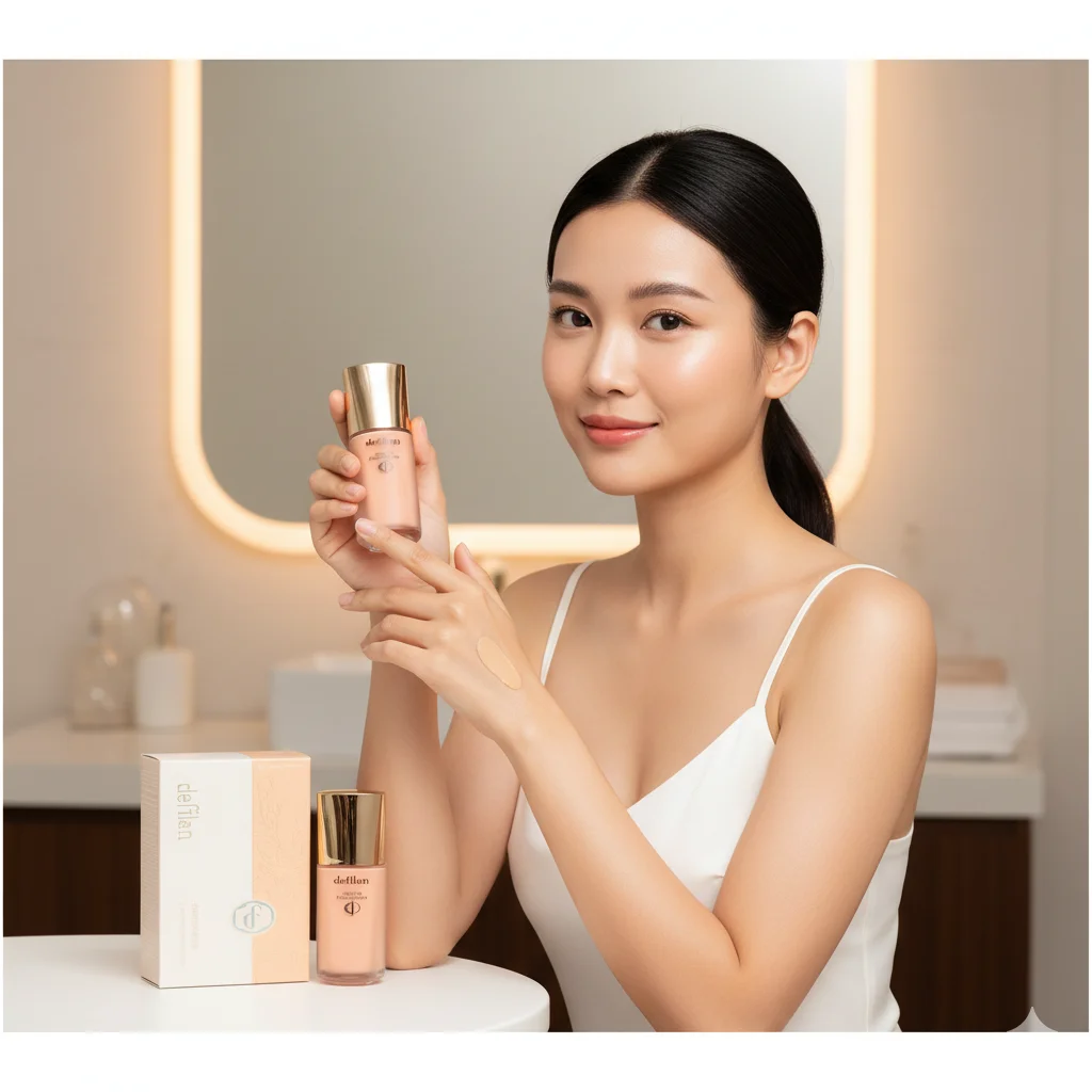 This product, branded as “defilan,” is a liquid foundation presented in a clear glass bottle with a gold pump dispenser, accompanied by a peach and white box with an elegant floral design. The Chinese characters on the box, “水漾丝滑精华粉底,” translate to “Watery Silky Essence Foundation.” This name suggests a formula designed to provide a smooth, hydrating, and lightweight coverage with a silky texture, aiming for a natural and comfortable feel on the skin.