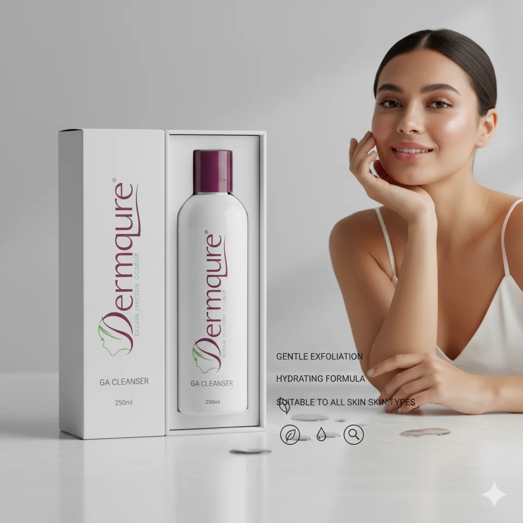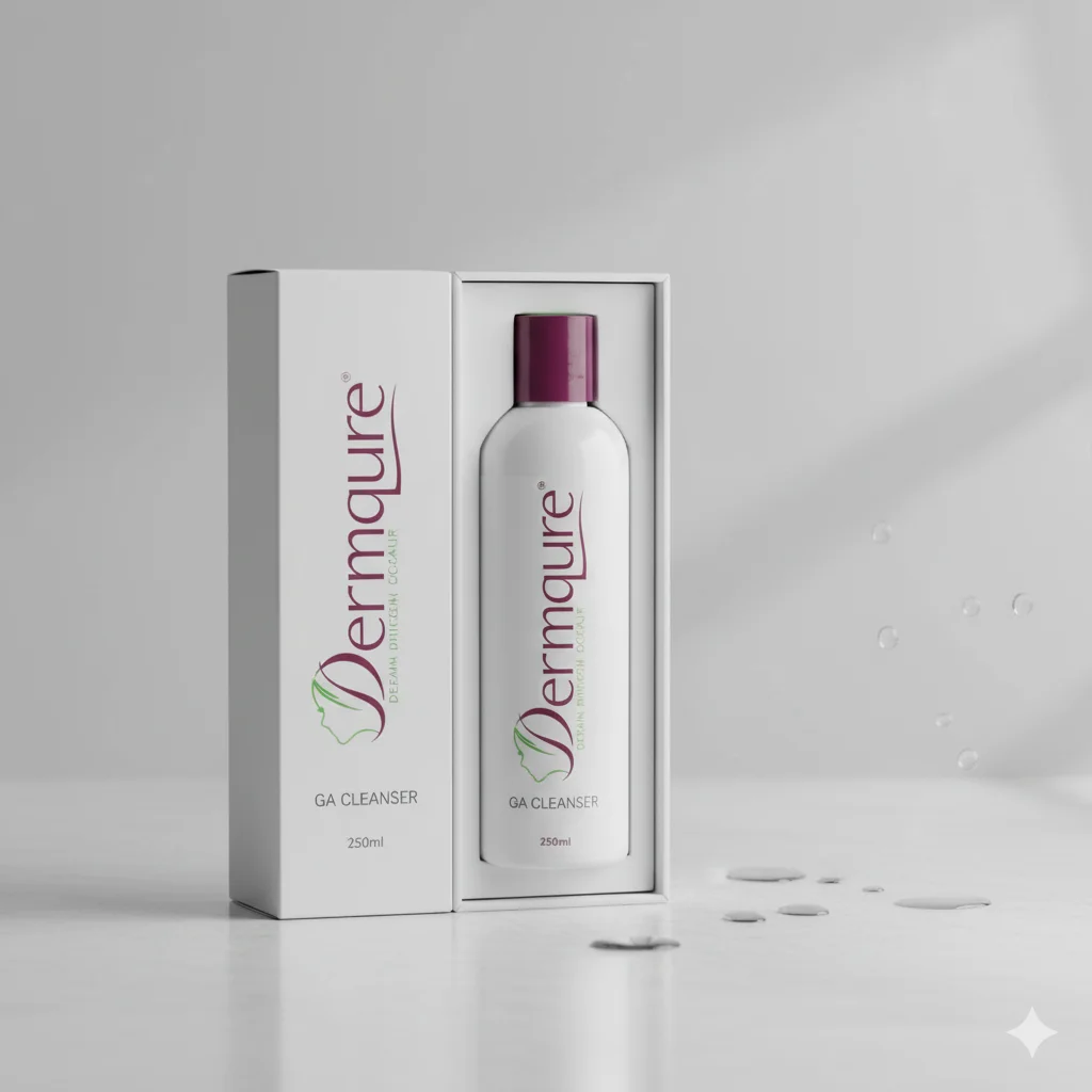 This product is a “GA Cleanser” from the brand Dermqure, presented in a sleek white bottle with a deep reddish-purple cap. The bottle’s design is minimalist, featuring the brand logo (Dermqure with a stylized green profile of a face) and “GA Cleanser” in a clean font, along with the volume of 250ml. It is showcased within its matching white cardboard box, which features the same branding and product information. The overall presentation suggests a professional or dermatological skincare product.