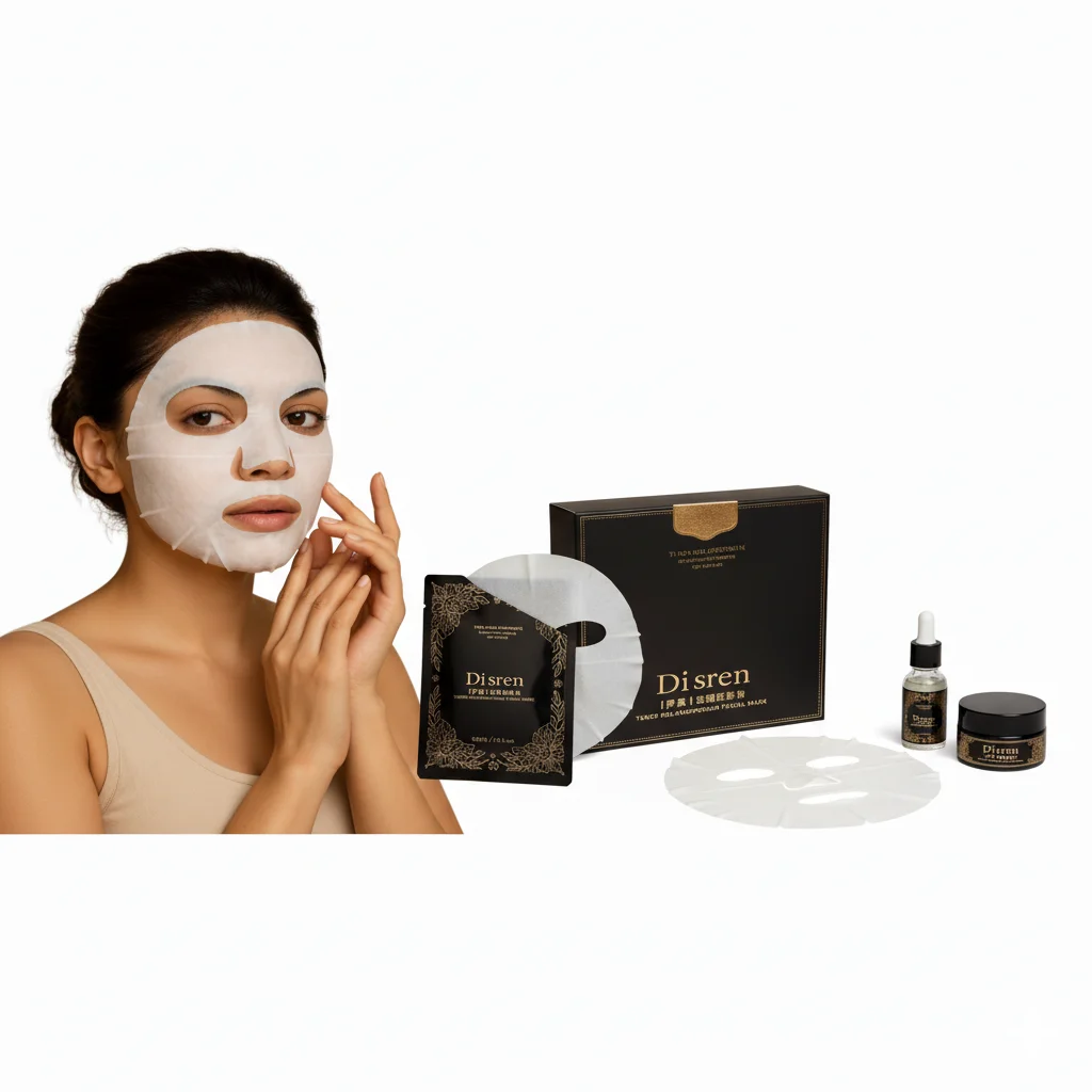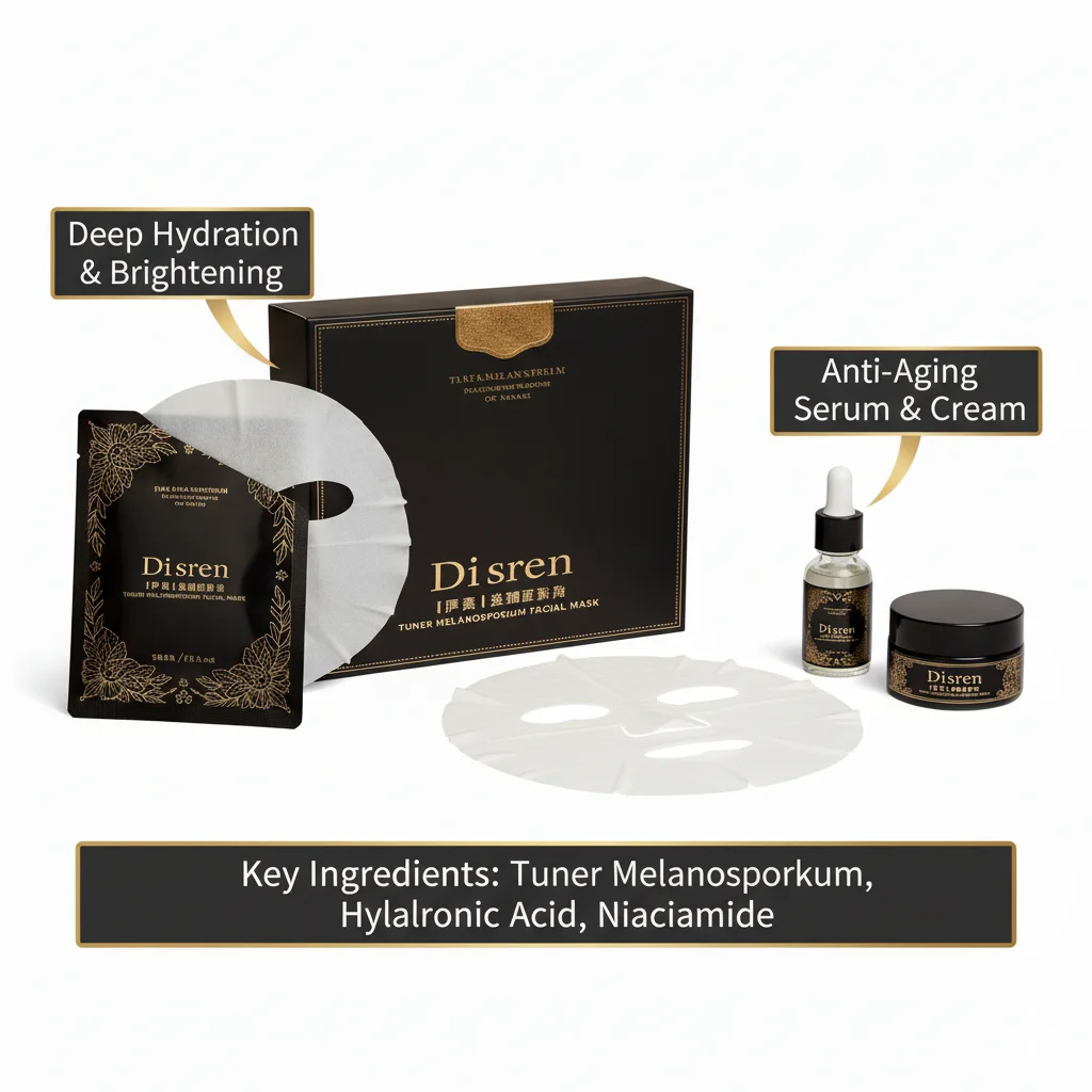 Based on the provided image, the Disren Tuner Melanosporum Facial Mask is a multi-piece skincare set elegantly presented in black and gold packaging, suggesting a premium or luxury positioning. While specific details about the product’s formulation and targeted benefits are not publicly available through web searches, a visual analysis of the components offers insights into its intended use.