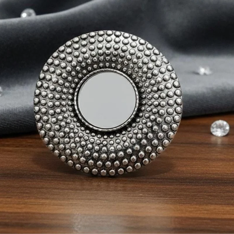 Elevate your jewelry collection with this stunning “Dotted Mandala” statement ring, a perfect blend of rustic charm and artistic elegance. This ring features a brilliant central mirror that reflects light beautifully, encased in a large circular frame adorned with hundreds of meticulously crafted raised dots. These dots are arranged in concentric circles, creating a captivating sunburst or mandala-like texture that draws the eye.