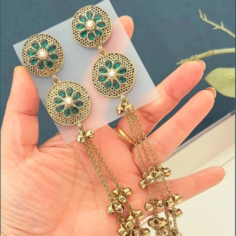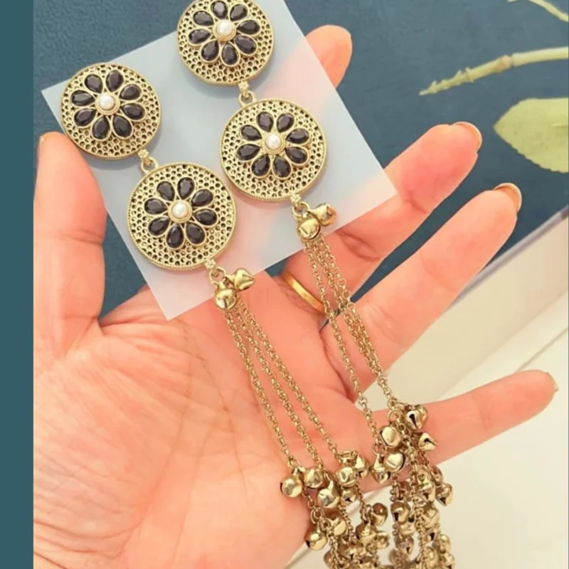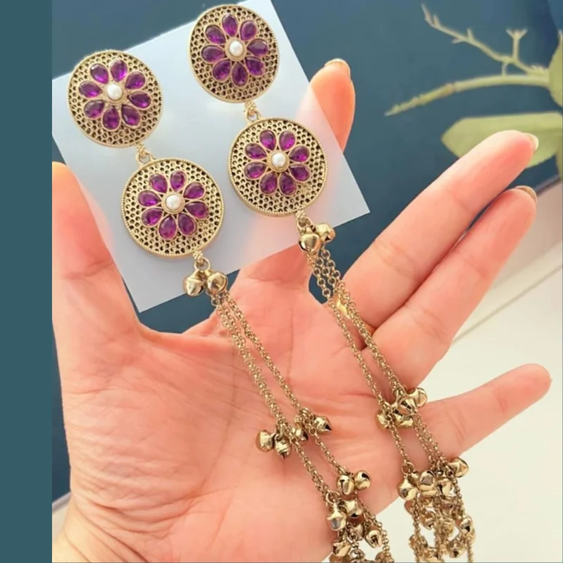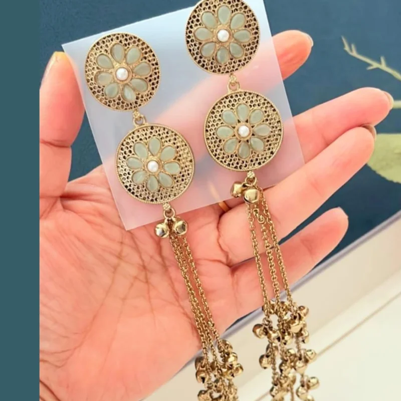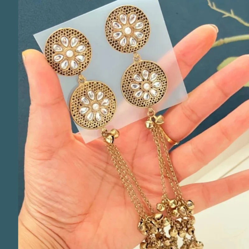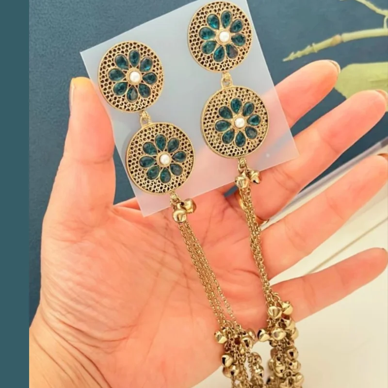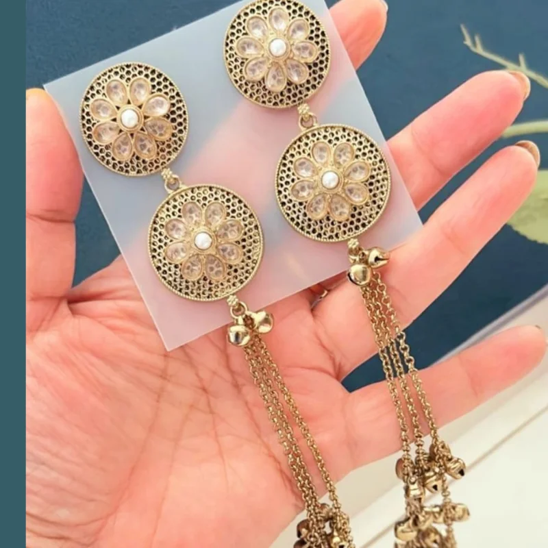 Double Disc Floral Earrings with Long Ghungroo Chains