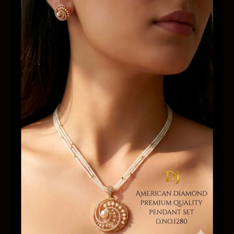 Experience the perfect harmony of dynamic design and classic elegance with this premium pendant set from Dreamjwell. This ensemble (D.No. 1280) features a captivating circular pendant with a sophisticated “whirlwind” or spiral architecture. The gold-toned frame is meticulously encrusted with high-grade American Diamonds (Cubic Zirconia) that curve inward toward a central, radiant pearl. A trail of smaller pearls follows the spiral path, creating a sense of movement and celestial beauty.