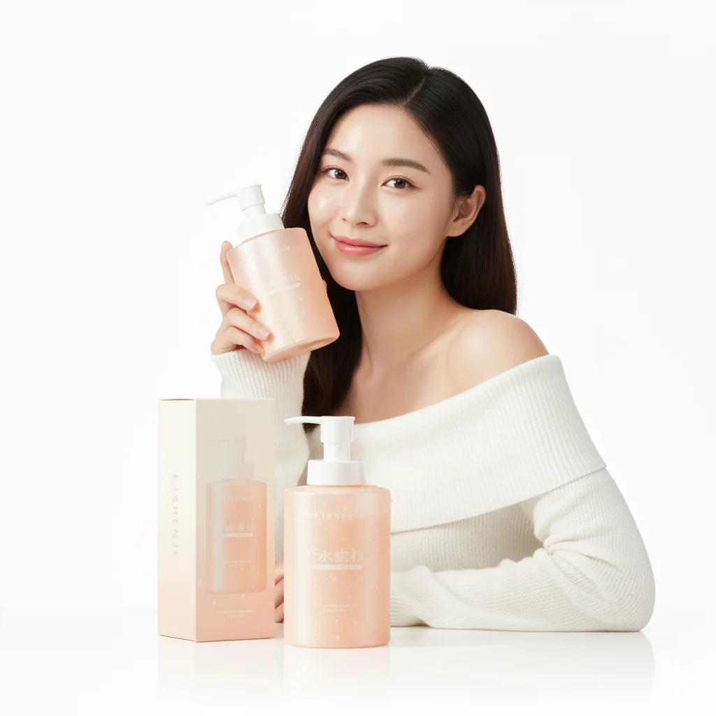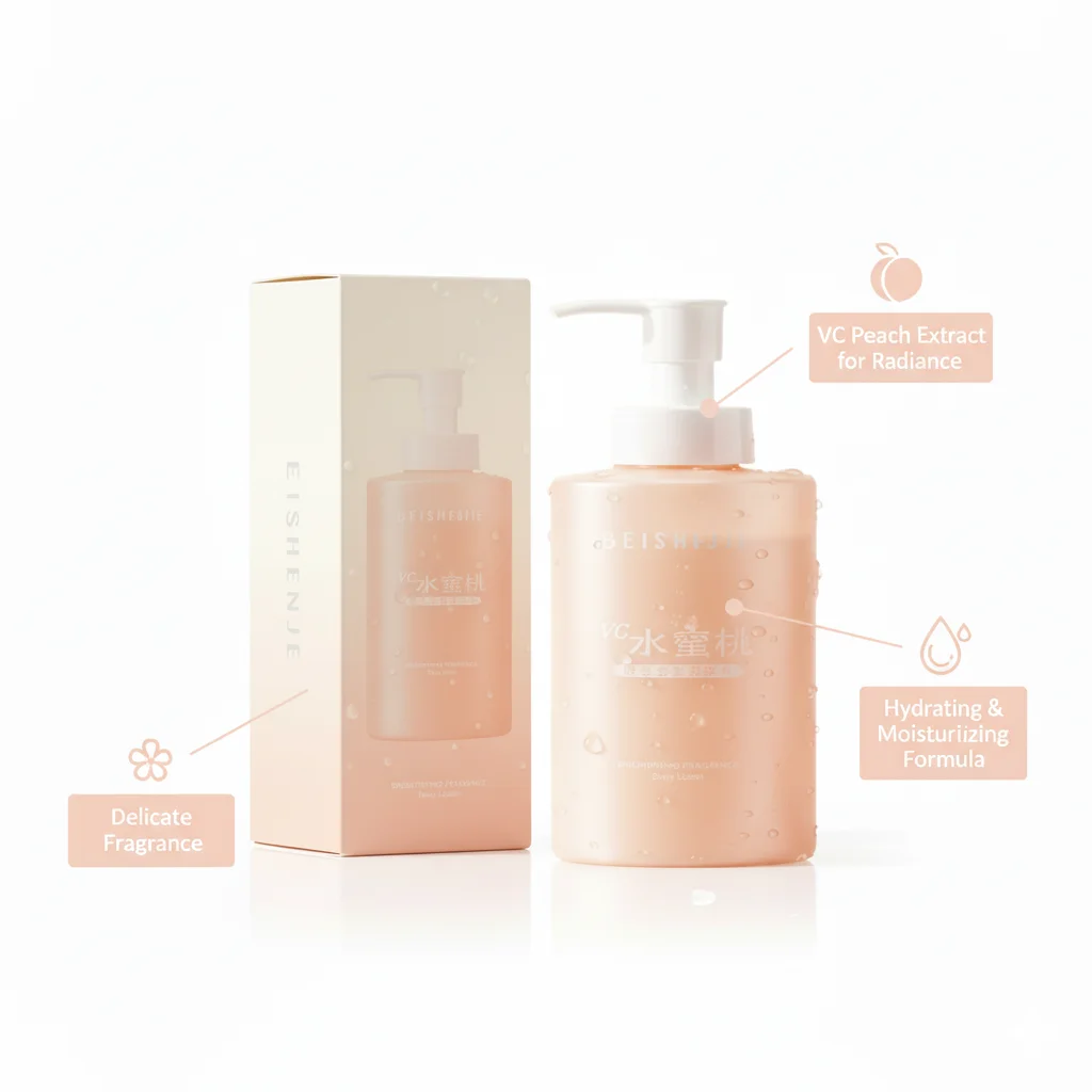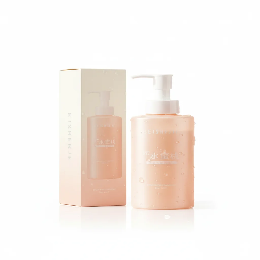 This product is the EISHENJE Brightening Fragrance Body Lotion, featuring a prominent Honey Peach designation. It is a skincare product designed to moisturize and brighten the skin, leaving behind a pleasant fragrance. The lotion is presented in a minimalist, peach-colored pump bottle, which is covered in stylized water droplets, suggesting hydration. The accompanying box features a similar design aesthetic. It should be noted that while the bottle is clearly labeled “Body Lotion,” the box shown in the image is labeled “Body Wash,” indicating a possible packaging discrepancy or that it belongs to a product line with similar branding.