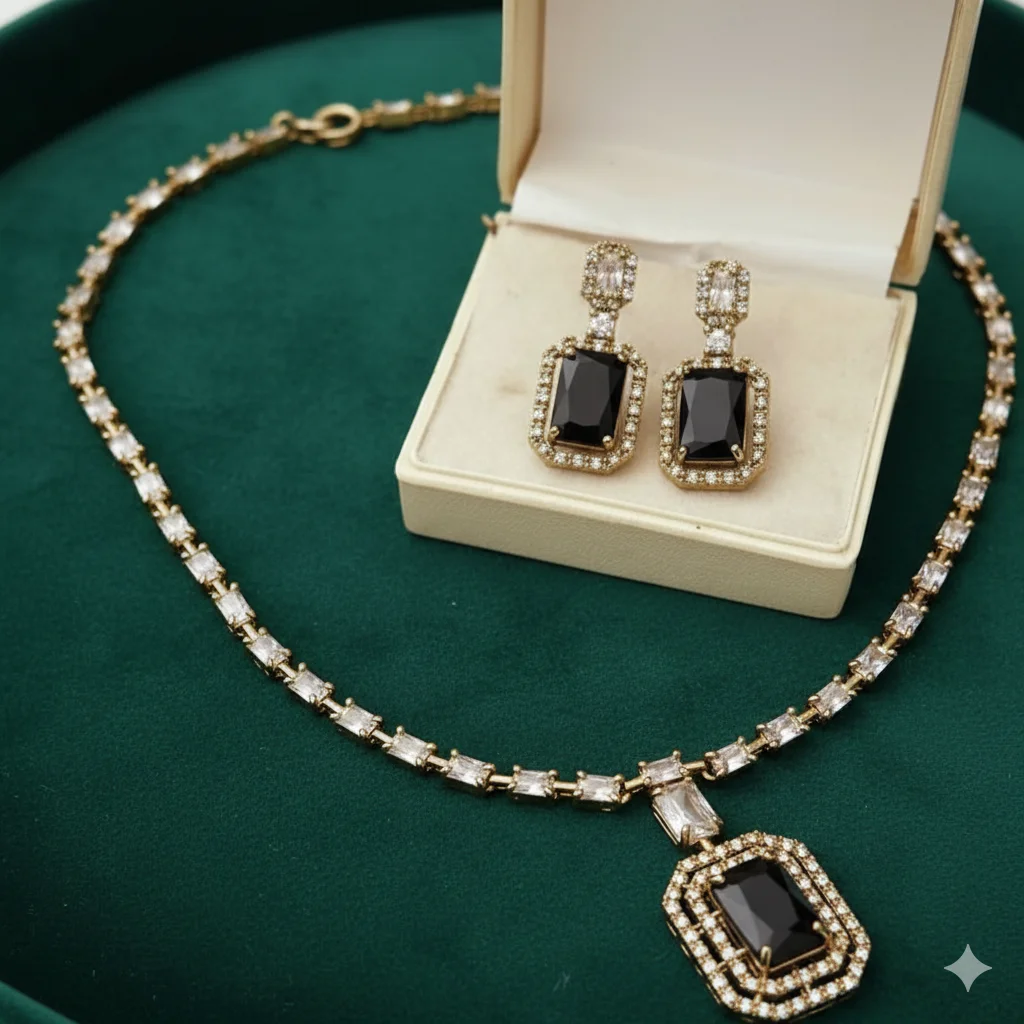 Elegant American Diamond (AD) Necklace Set with Antique Mehndi Polish – Geometric Emerald Cut Design