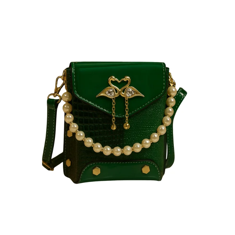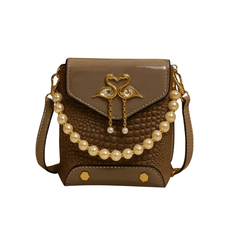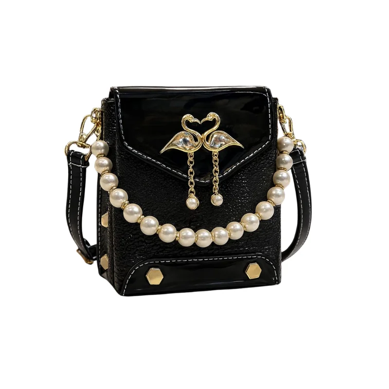 Elegant Crossbody Bag with Pearl Handle & Crystal Swan Heart Emblem – Chic Faux Leather Shoulder Purse
