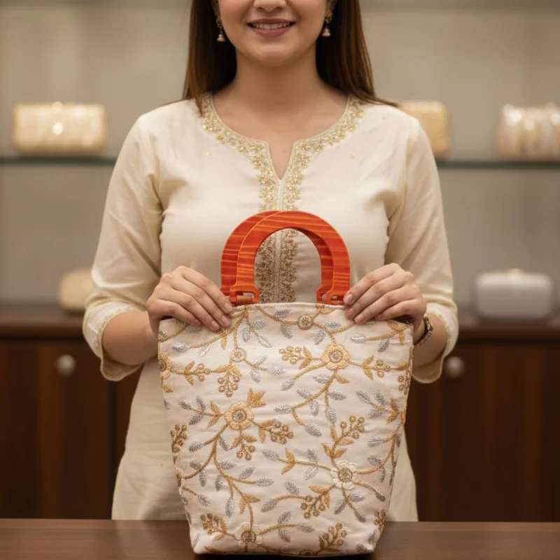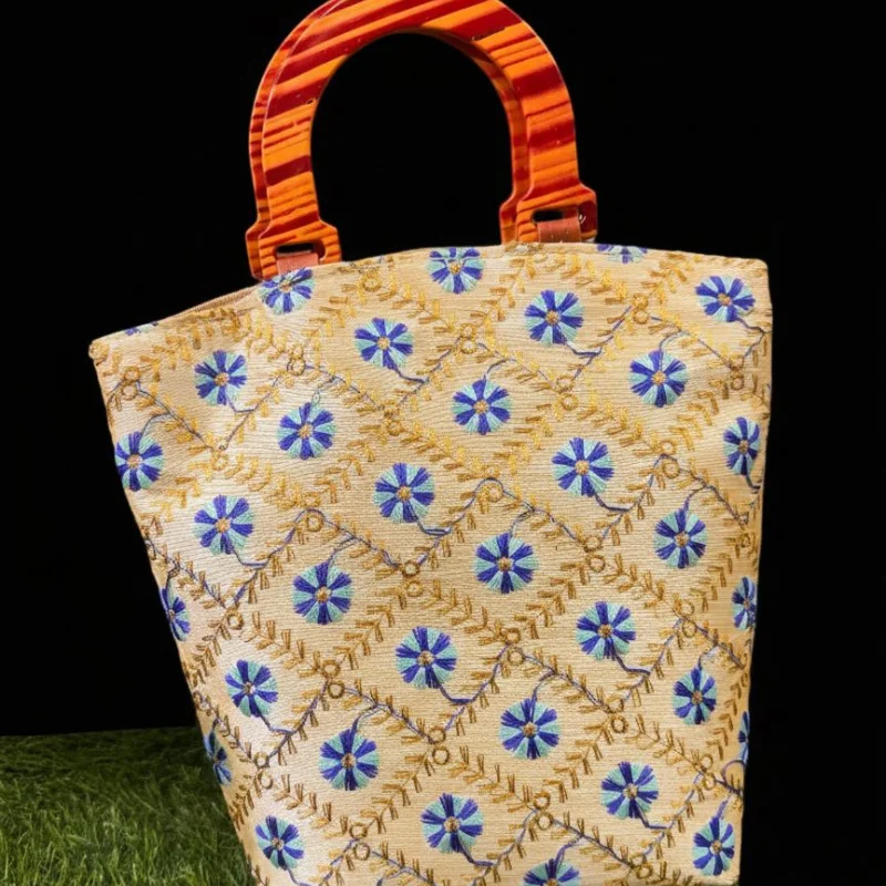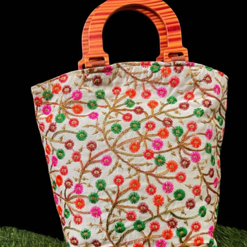Elegant Floral Embroidered Handbag with Wooden Handle
