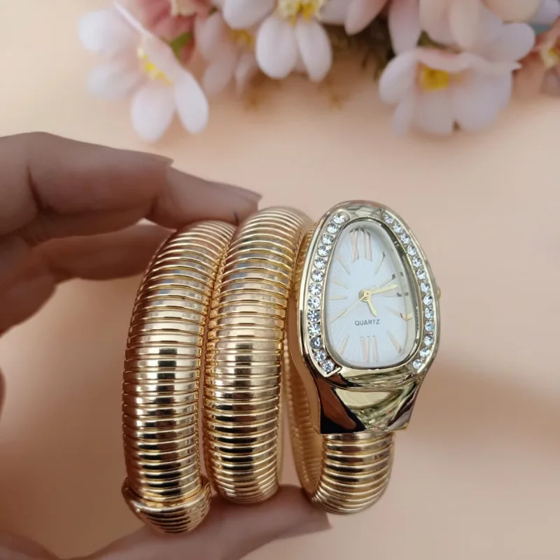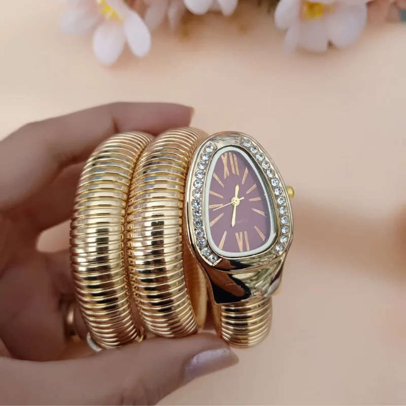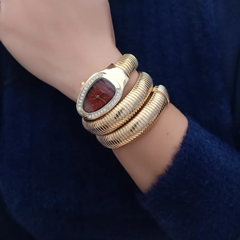 Elegant Gold Snake-Wrap Bracelet Watch with Crystal Bezel