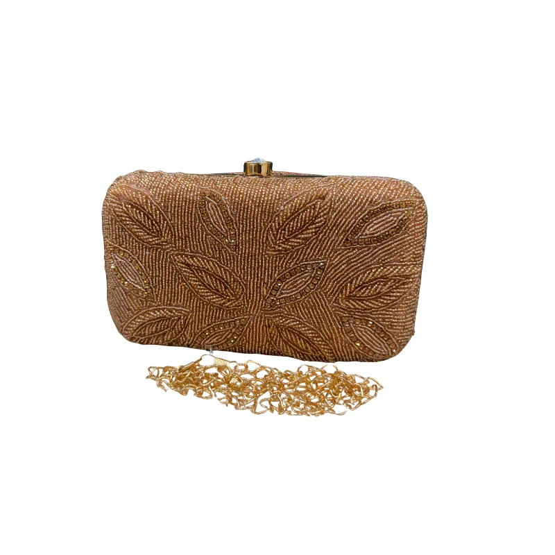 Elegant Hand-Beaded Evening Clutch – Crystal Leaf Motif Minaudière with Detachable Gold-Tone Chain for Weddings & Proms