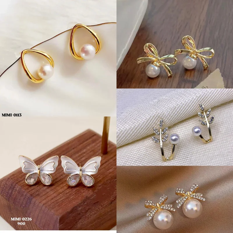 Top Right: Polished Gold Bow Pearl Studs. These charming studs feature a smooth, high-shine gold-toned bow with a single pearl drop, offering a simple yet elegant aesthetic for everyday wear.