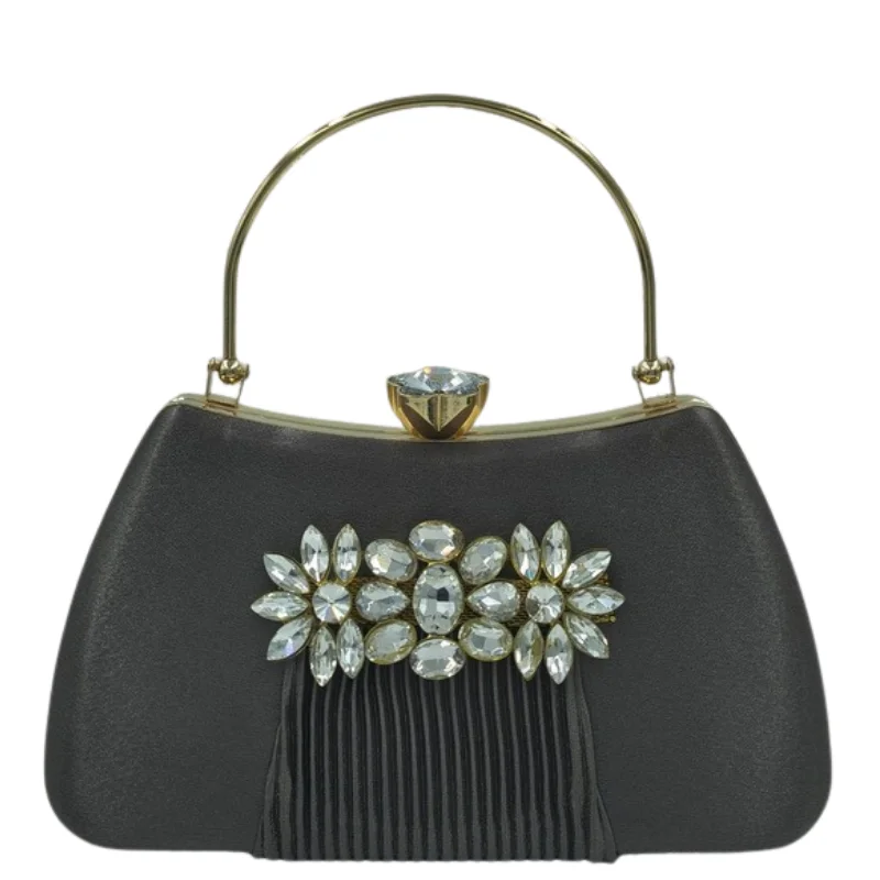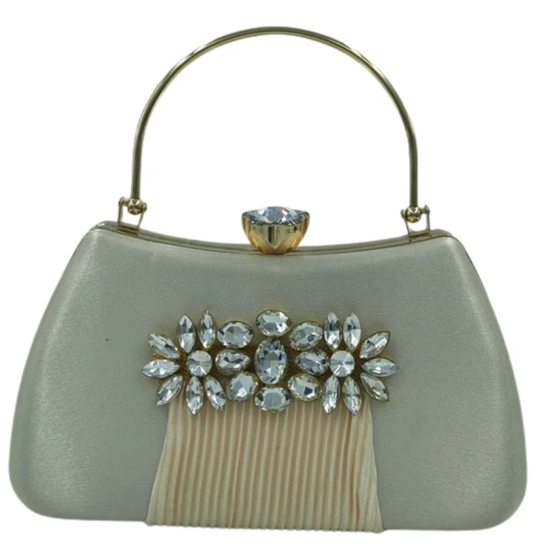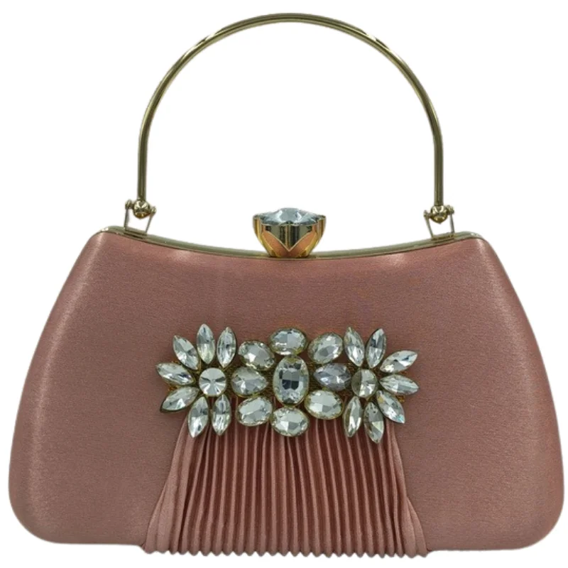 Elegant Satin Evening Clutch with Crystal Floral Brooch & Pleated Detail – Gold-Tone Top Handle Bag