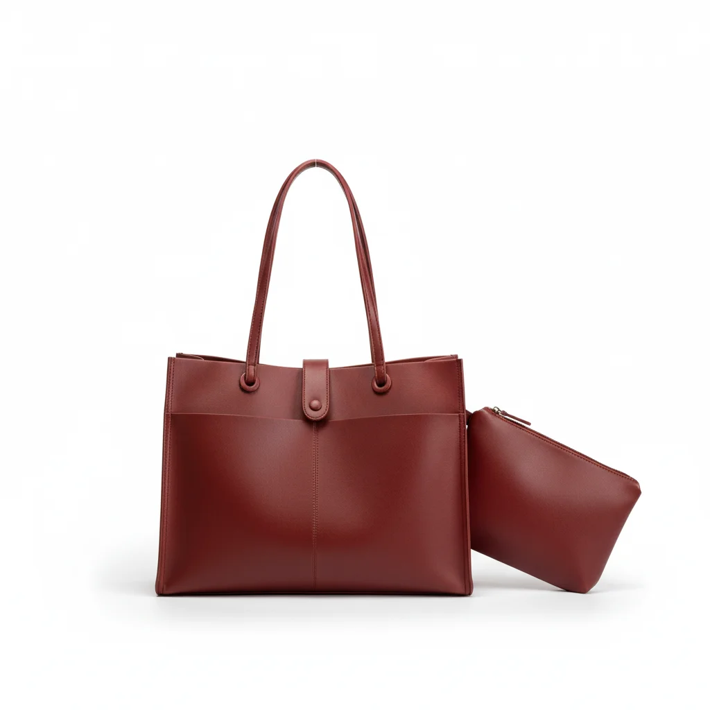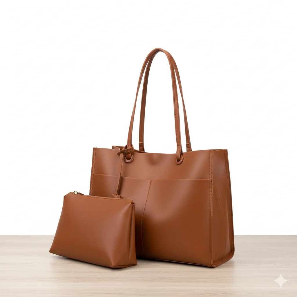 Elegant Structured Vegan Leather Tote Bag Set with Matching Zipper Clutch