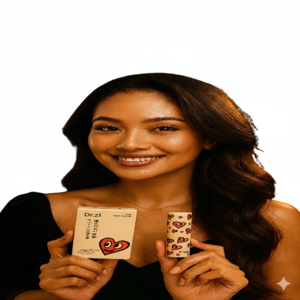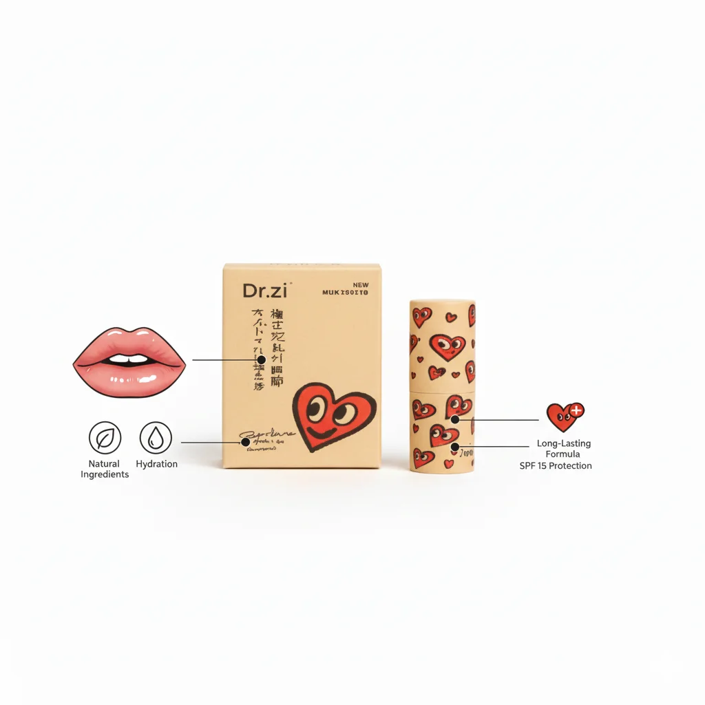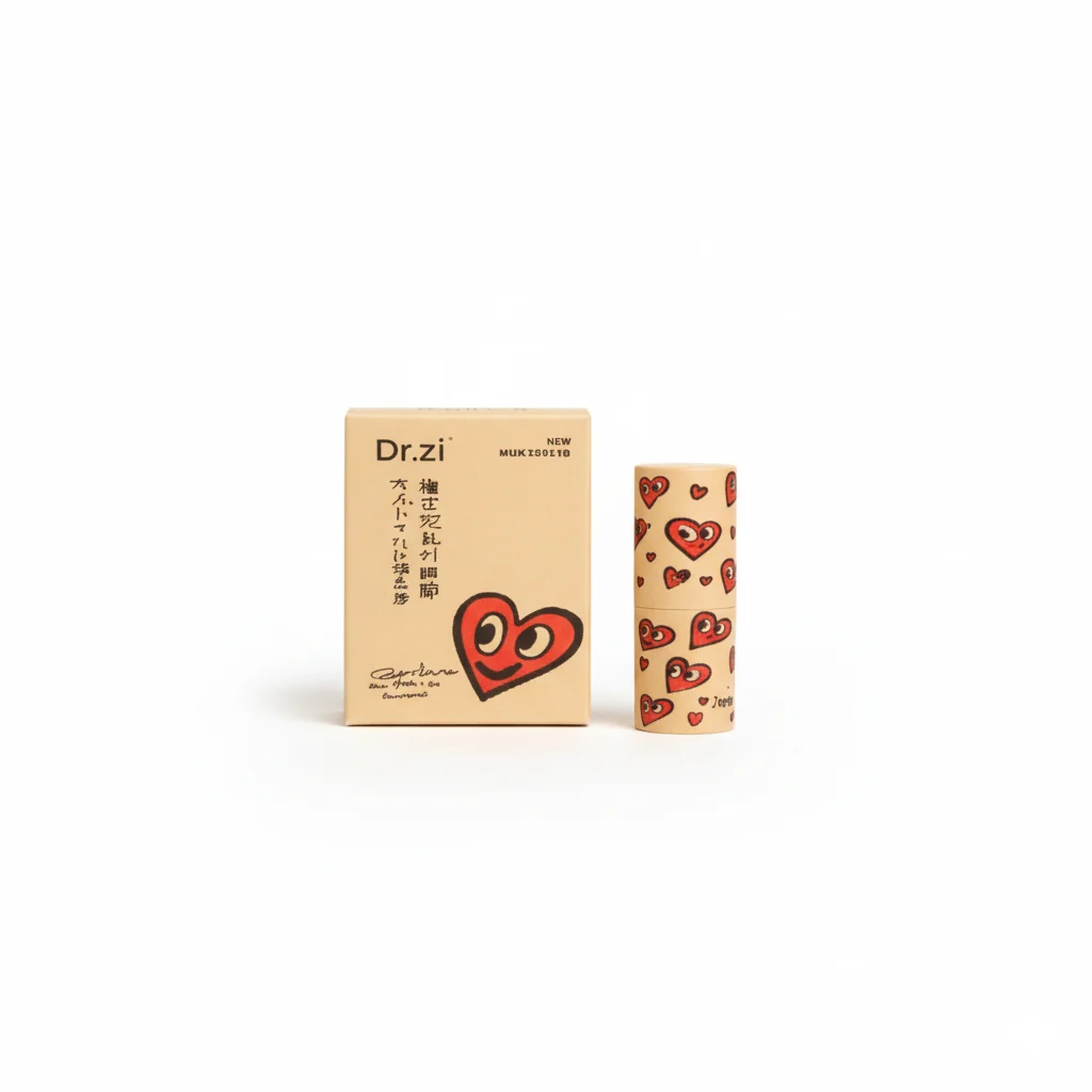A cosmetic product, believed to be a lip balm from the Chinese brand Dr.zi, has captured attention due to its distinctive packaging. The product is housed in a cylindrical tube adorned with a playful pattern of red hearts, and its corresponding box features a minimalist design with a single, stylized smiling heart.