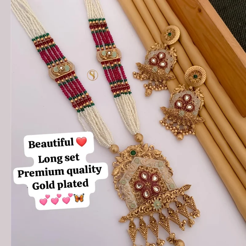 Adorn yourself with the royalty of a bygone era with this Premium Quality Long Necklace Set (Rani Haar). Designed for the woman who loves to make a statement, this jewelry set perfectly balances traditional grandeur with intricate craftsmanship.